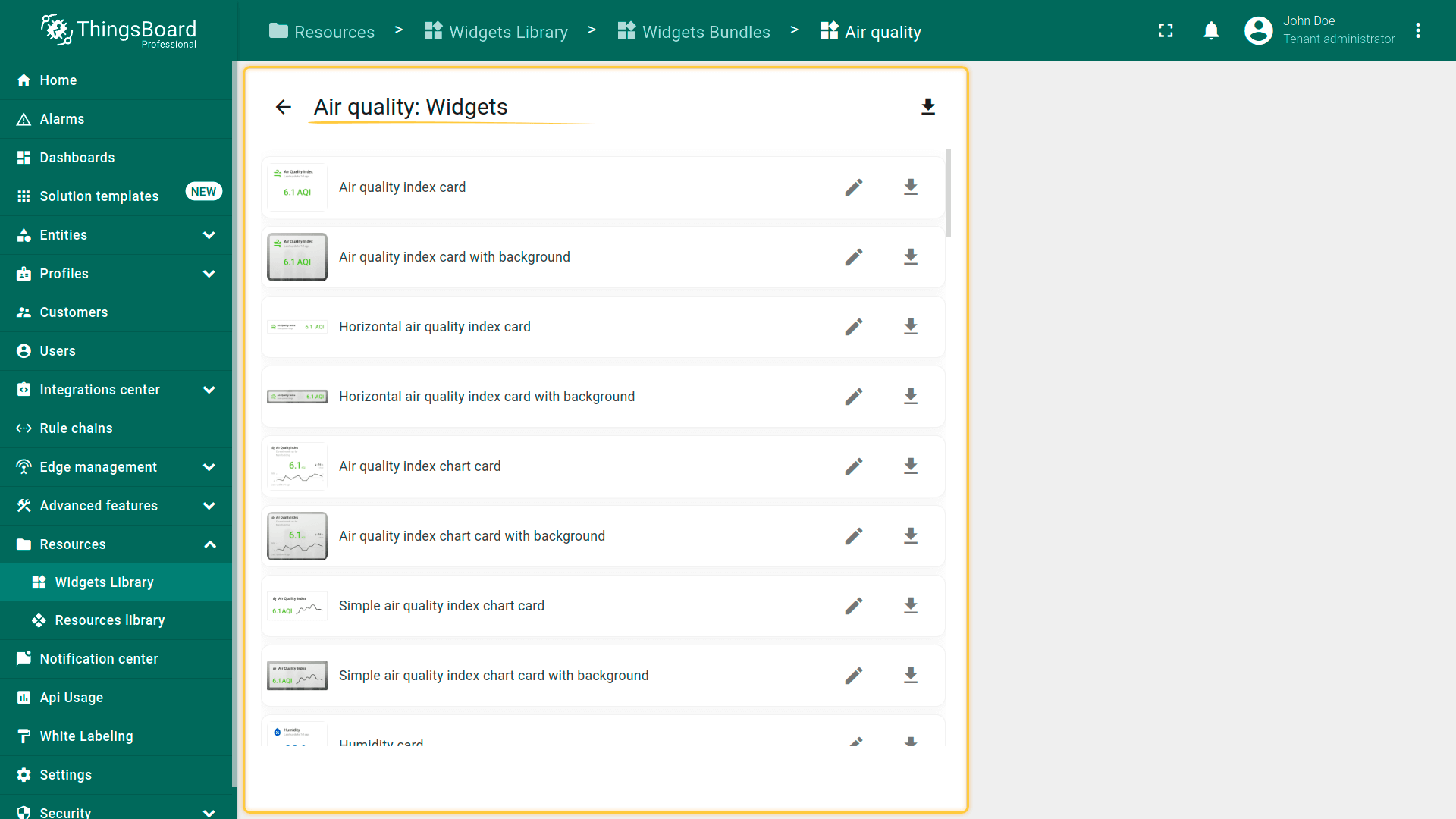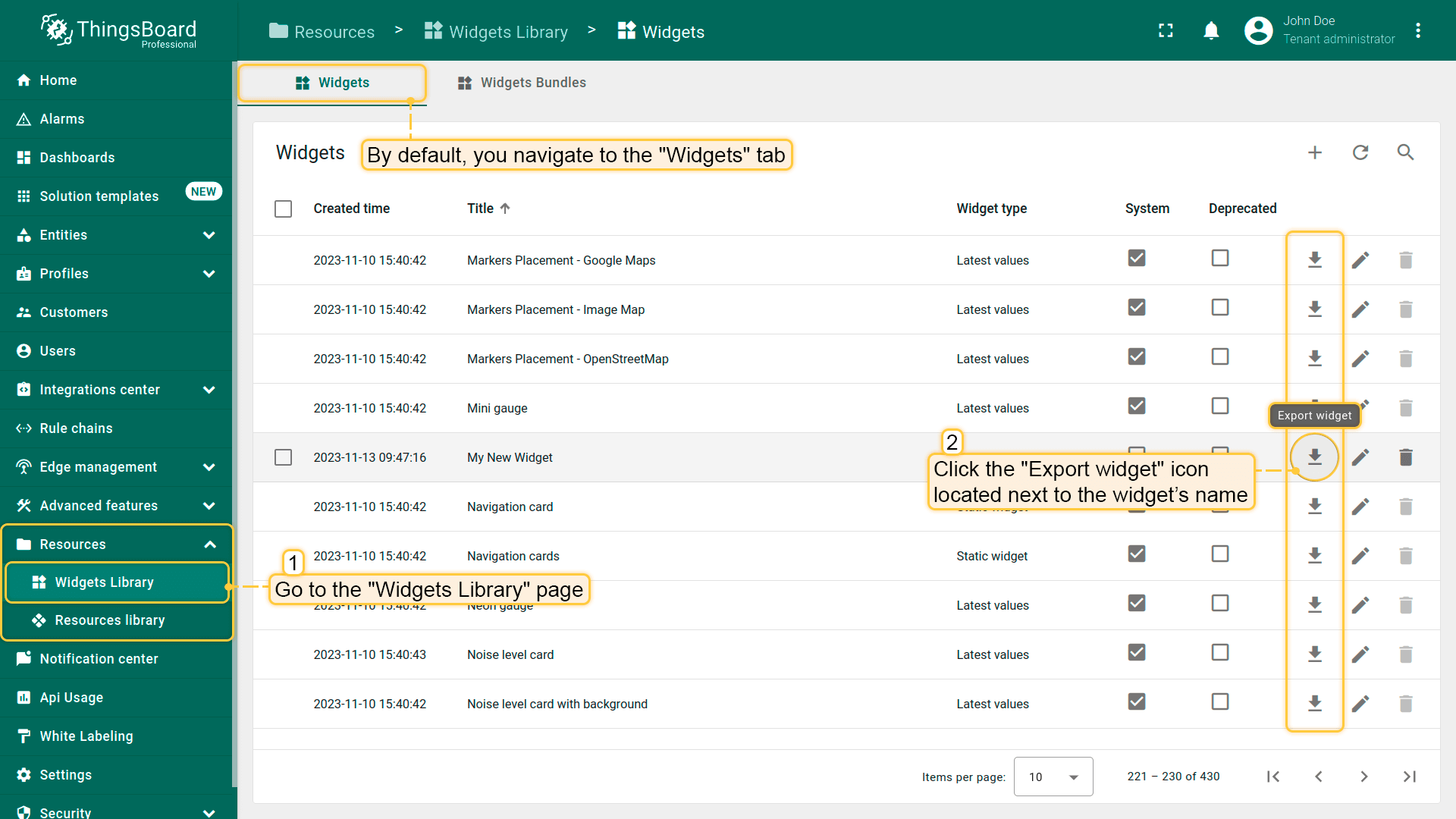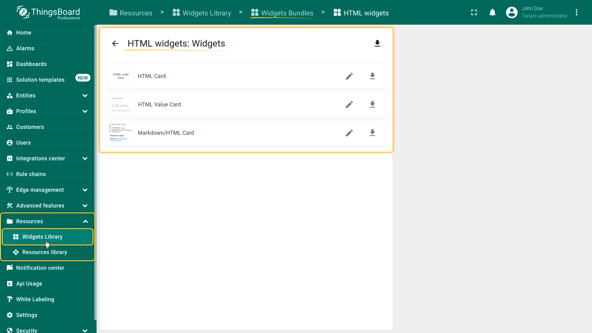 In order to export a widget type, you should go to the Widgets Library page, navigate to the “Widgets” tab and click the export button on the particular widget card. The widget configuration file will be saved in JSON format on your computer.