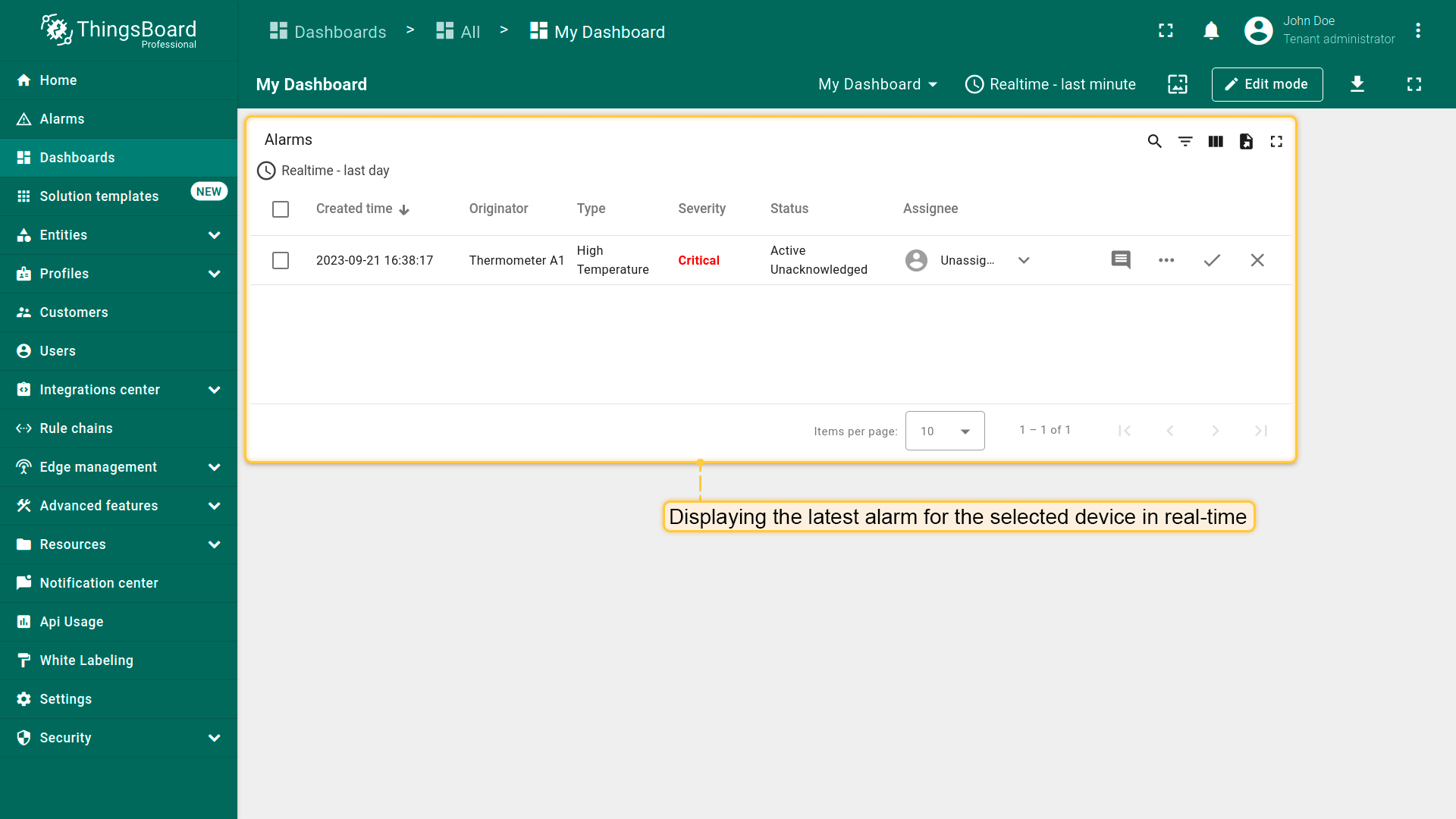 The Alarm widgets bundle is useful for visualization of alarms for specific entities, both in real-time and history modes.