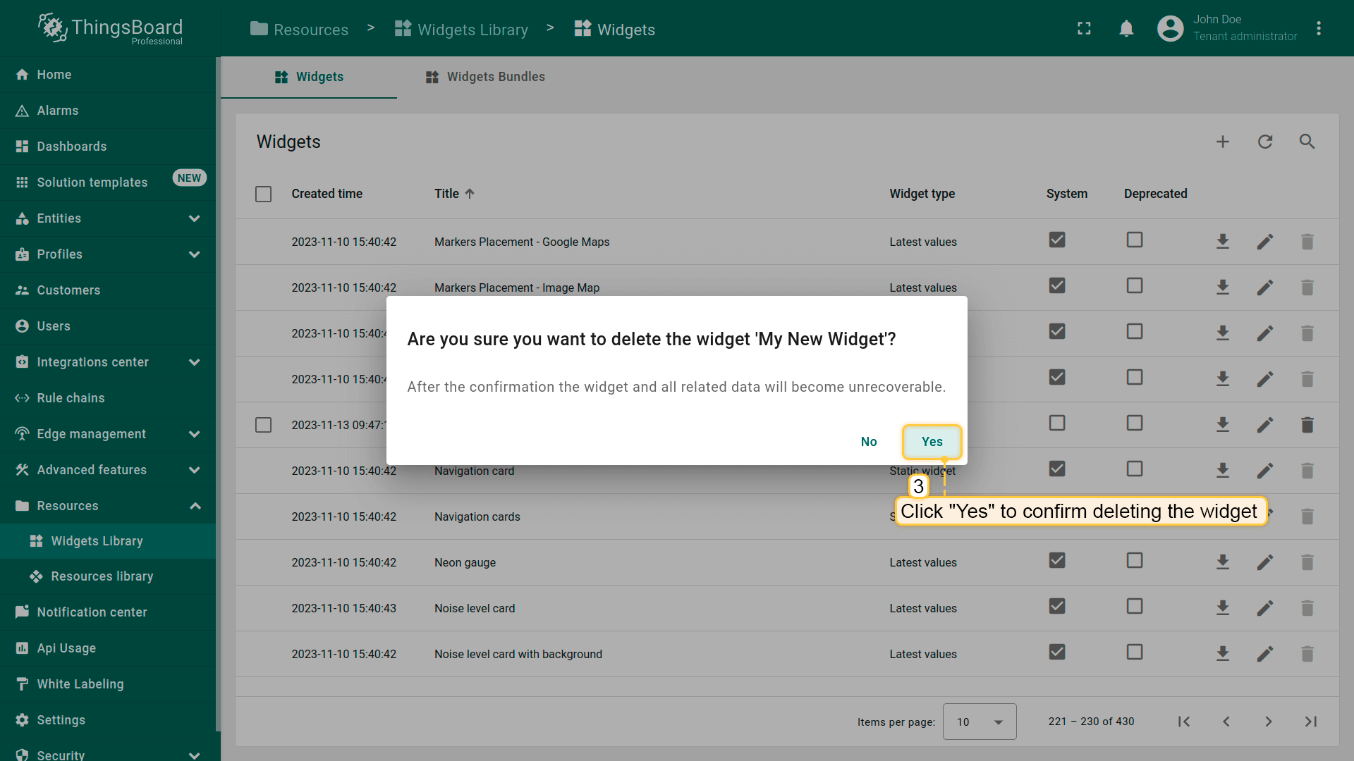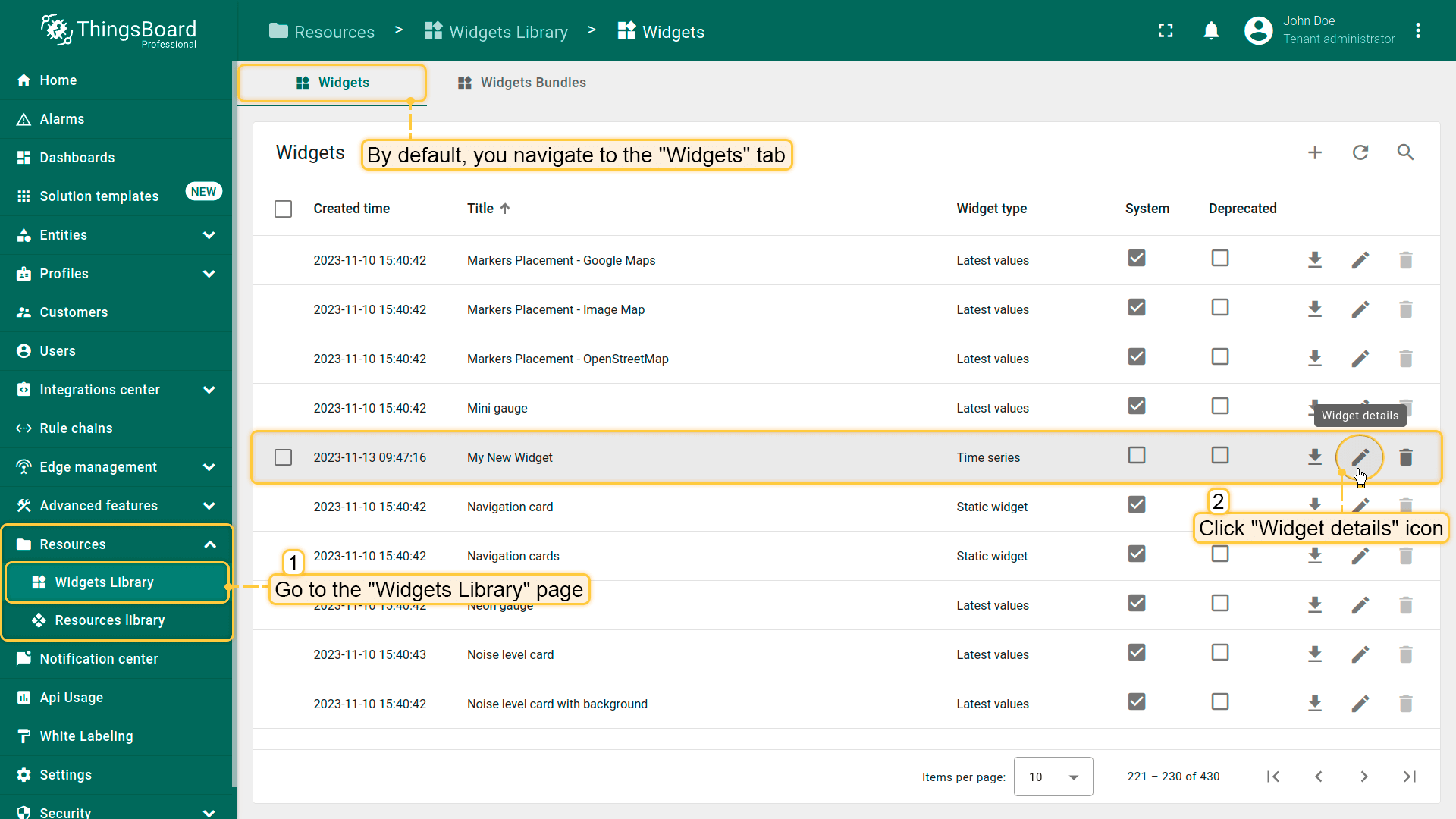 When a system administrator adds a new widget, it automatically becomes a system widget. This means that only the administrator has the privilege to modify, or delete the widget. Tenant administrators can also create widgets, but they are granted permission to modify only the widgets they have created. You can always implement and add your widgets by following this guide.