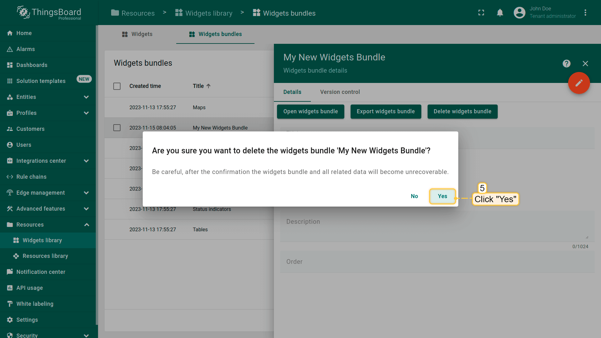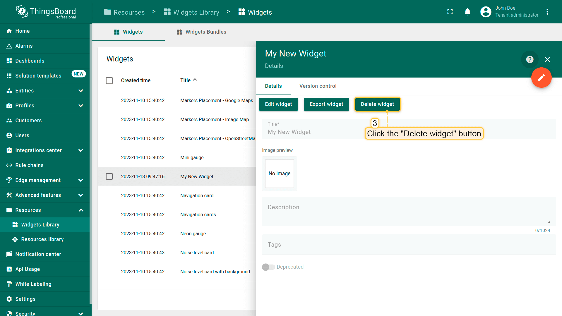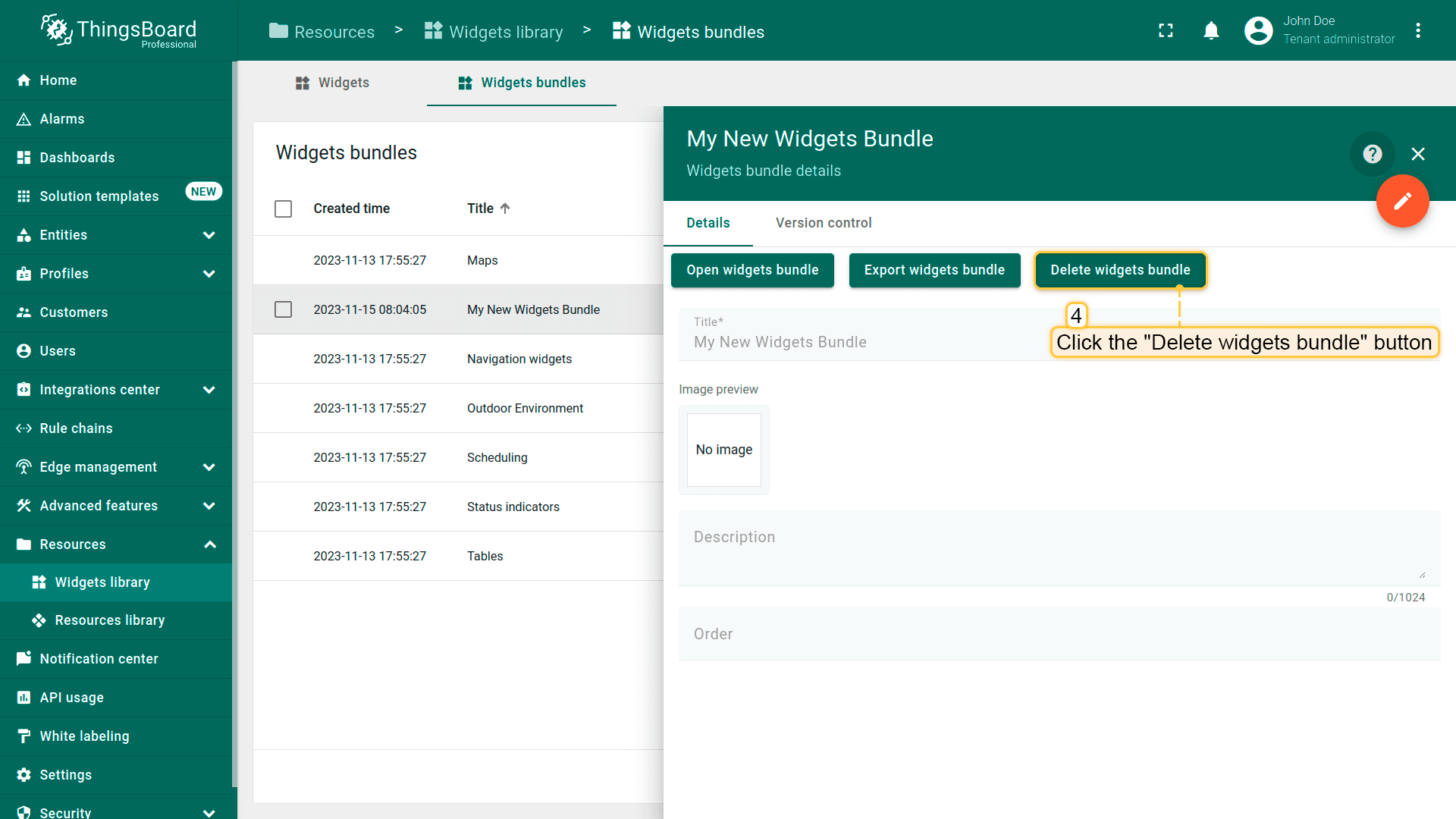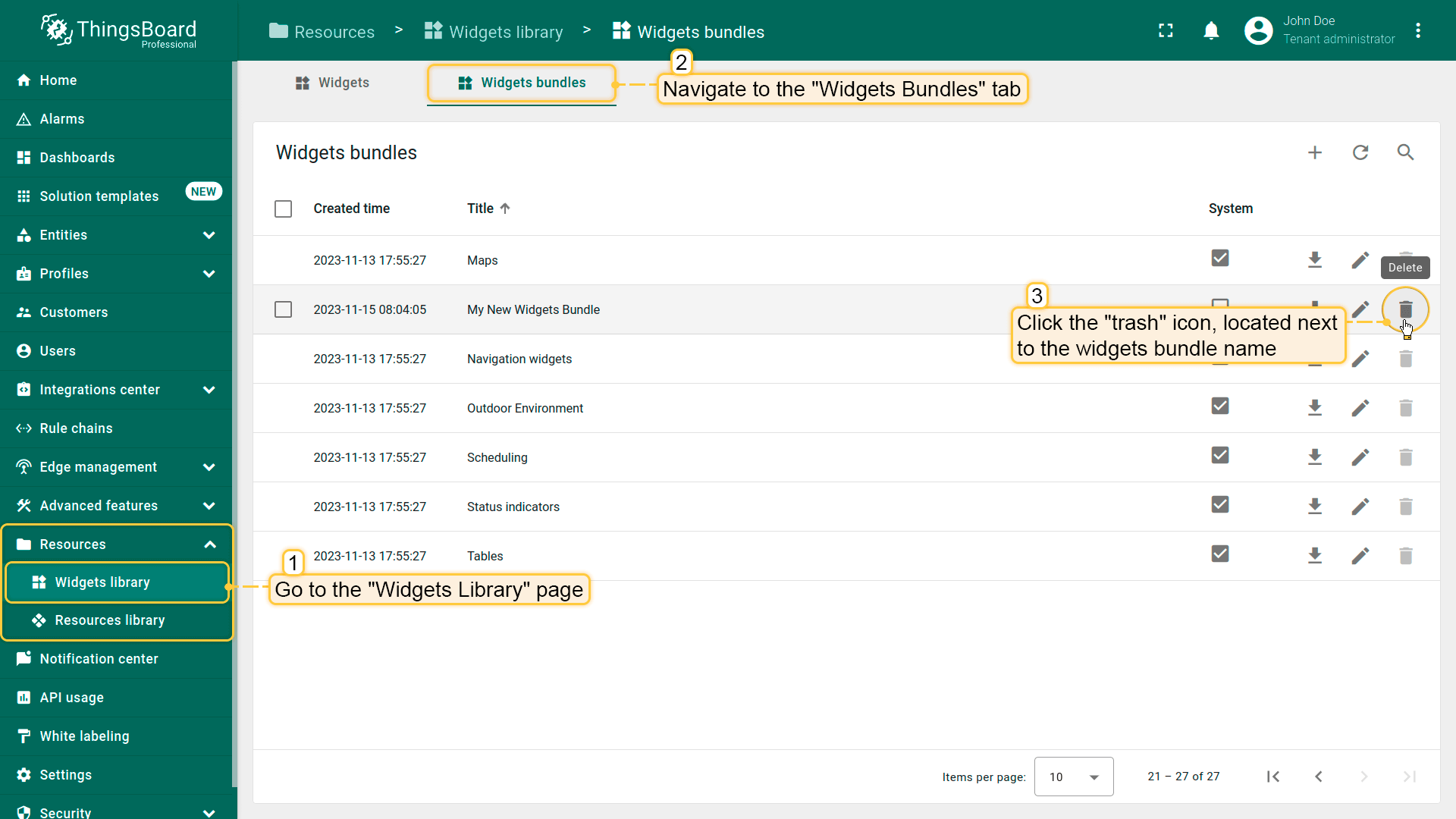 The system administrator or tenant administrator can delete a widgets bundle using one of the following ways: