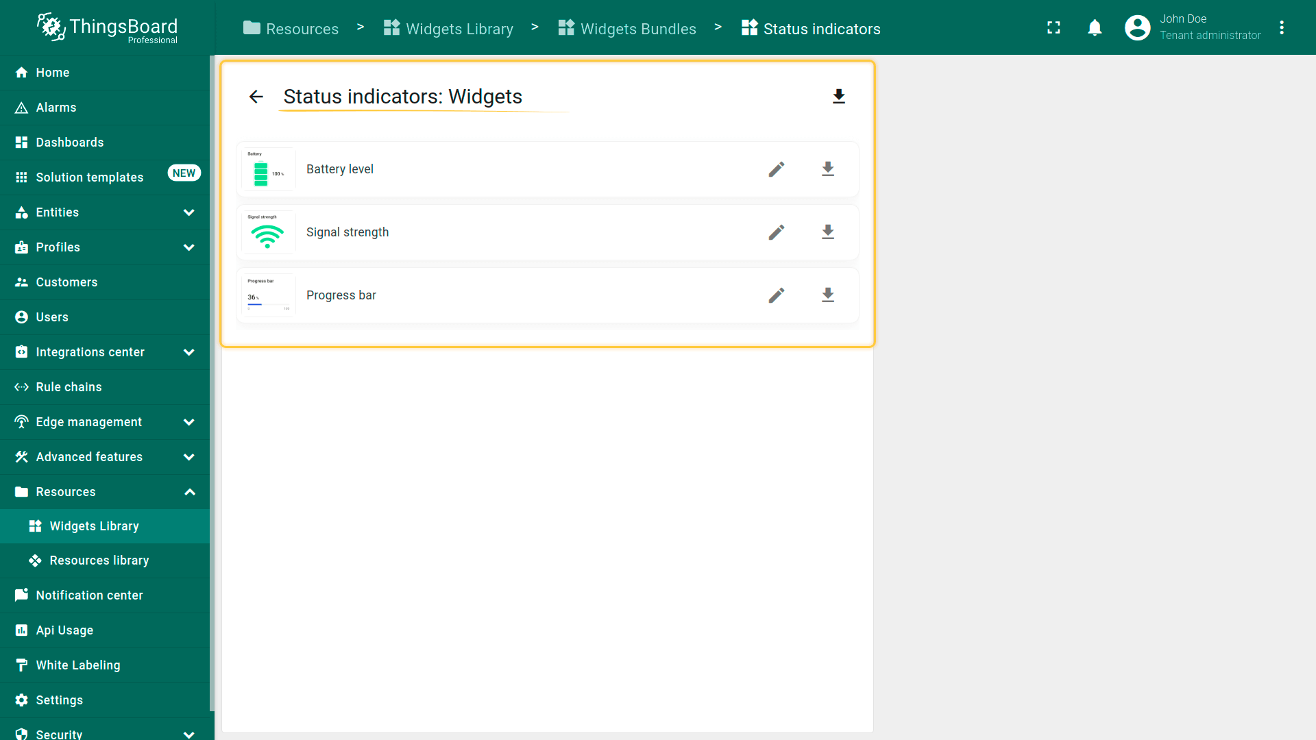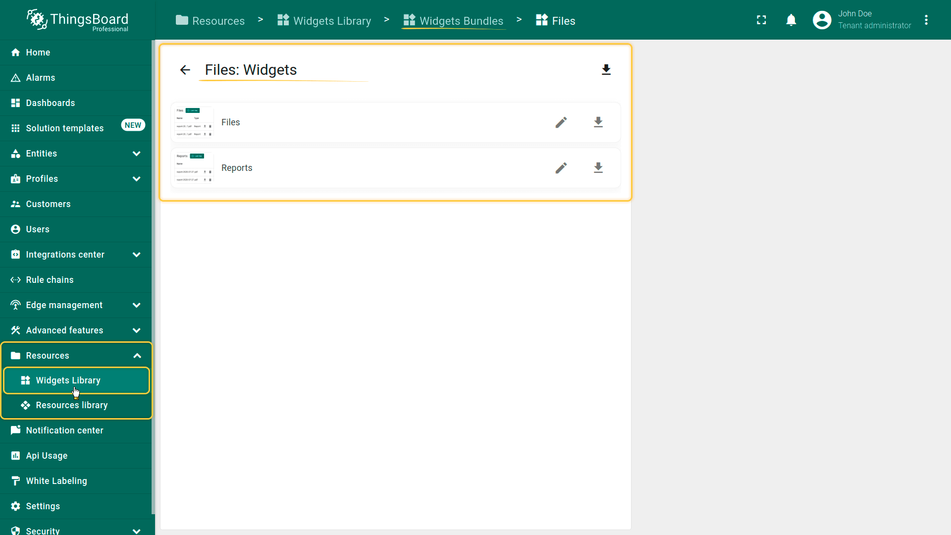 There are system-level and tenant-level widget bundles. Initial IoT Hub installation comes with a basic set of system-level widget bundles.