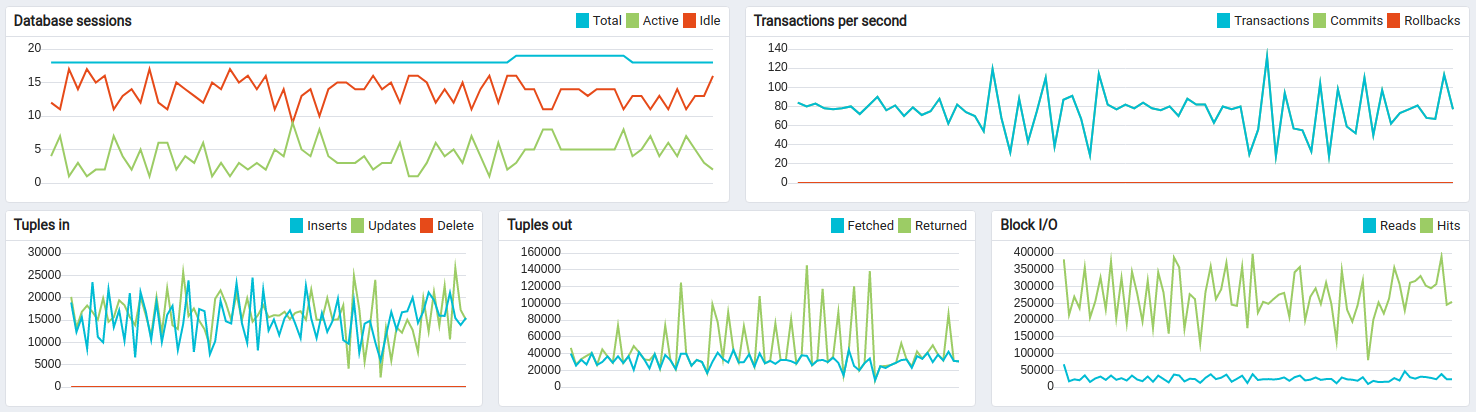 As result, you can see the dashboard with real time PostgreSQL metrics.