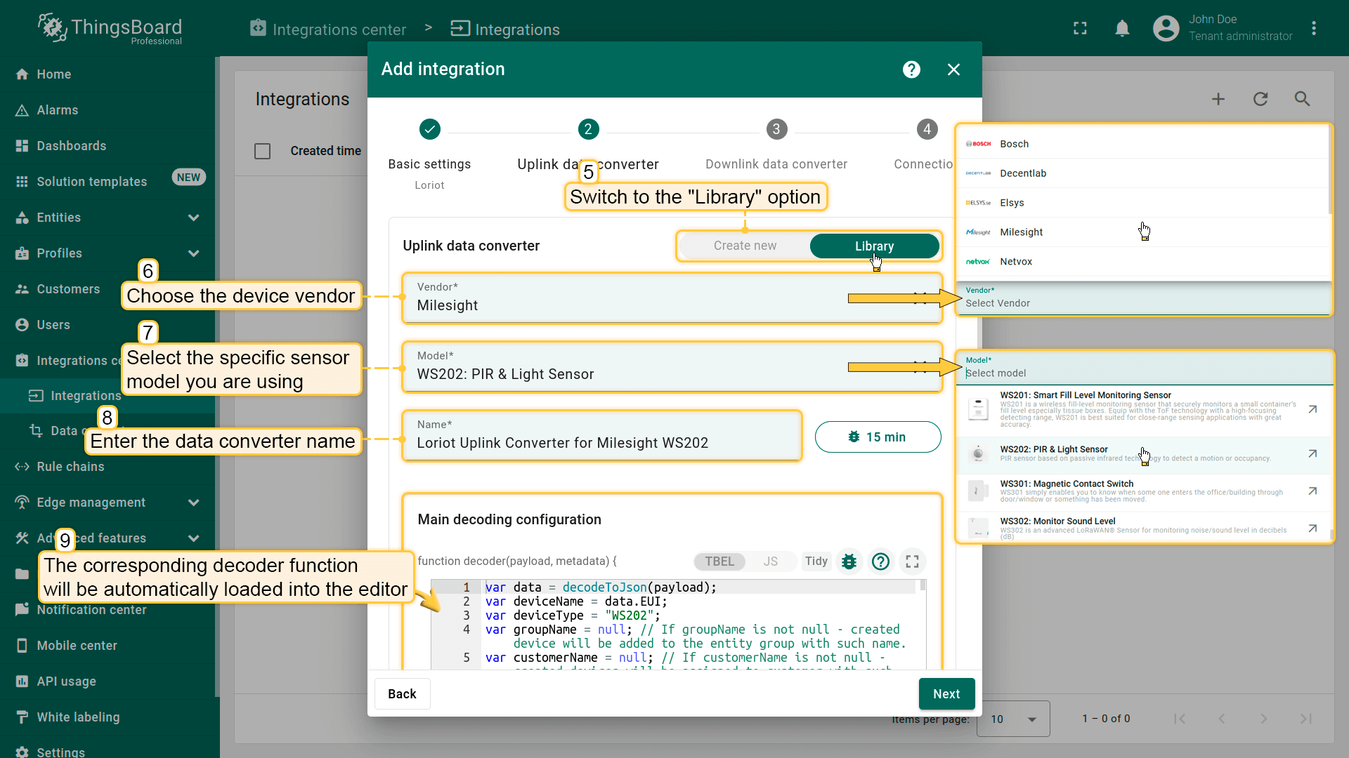 Switch to the “Library” option. From the dropdown menu, choose the device vendor. Then select the specific sensor model you are using. The corresponding decoder function will be automatically loaded into the editor.