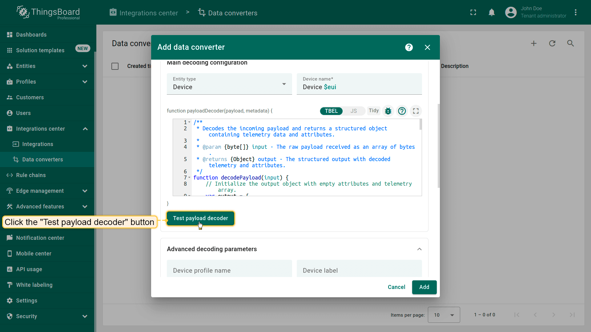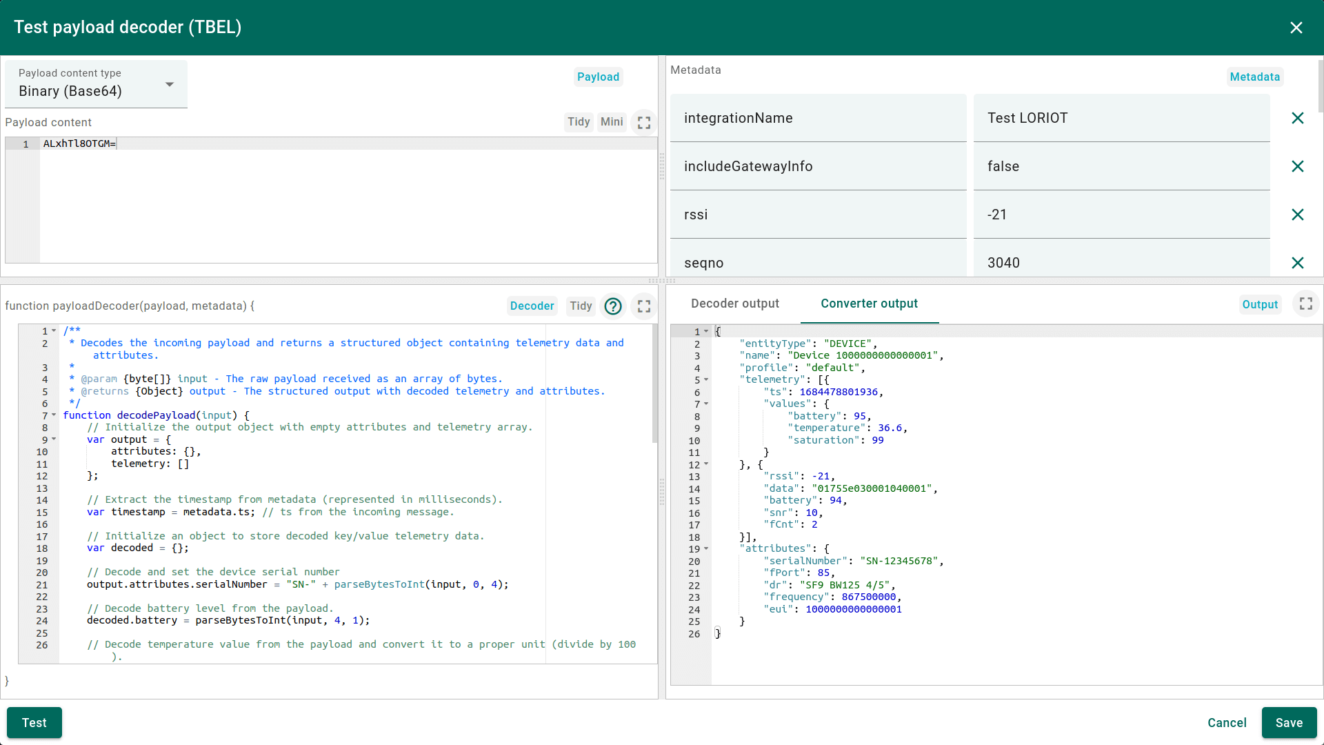Click the “Test payload decoder” button to validate the decoding logic used to process incoming device data.