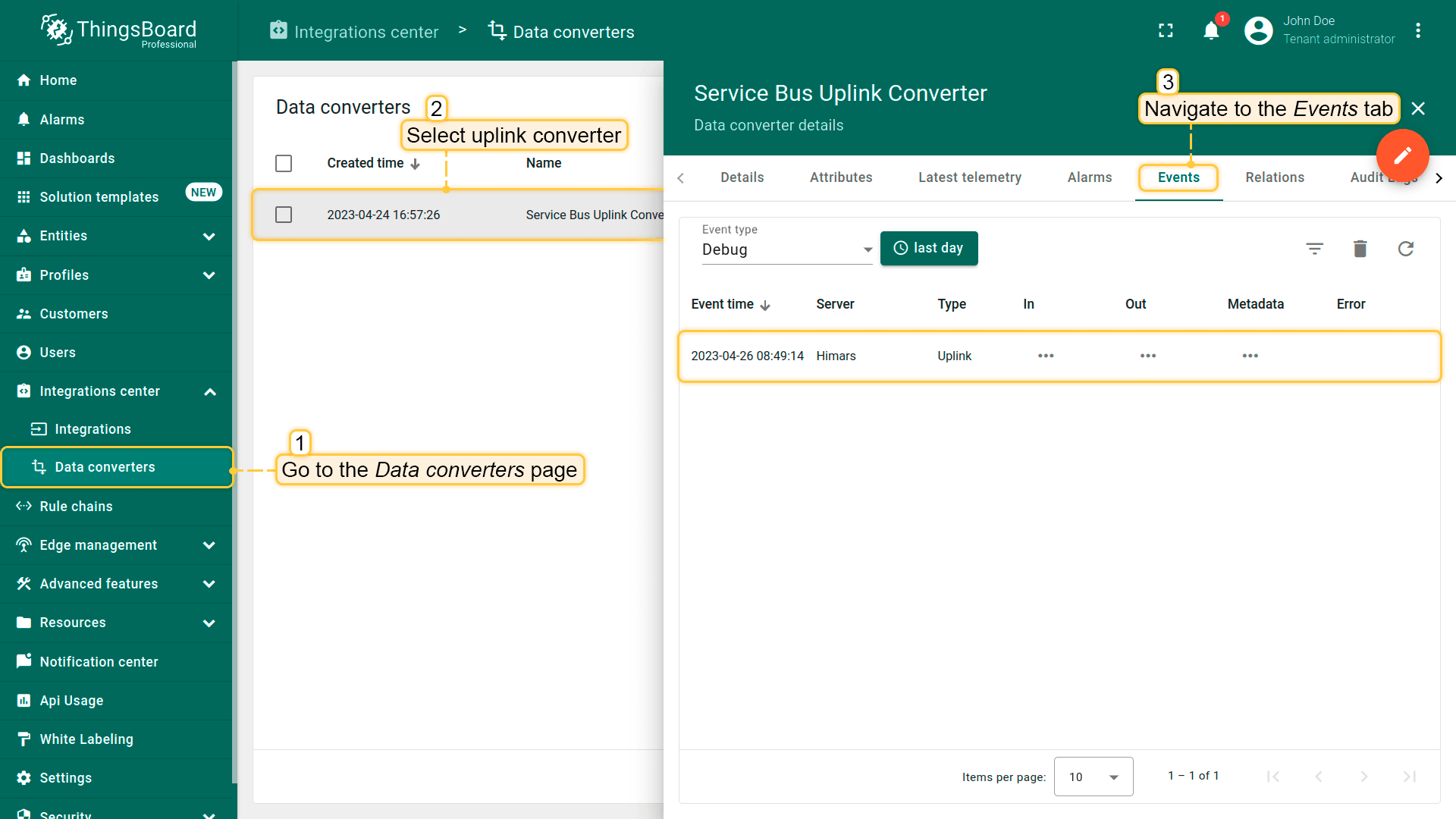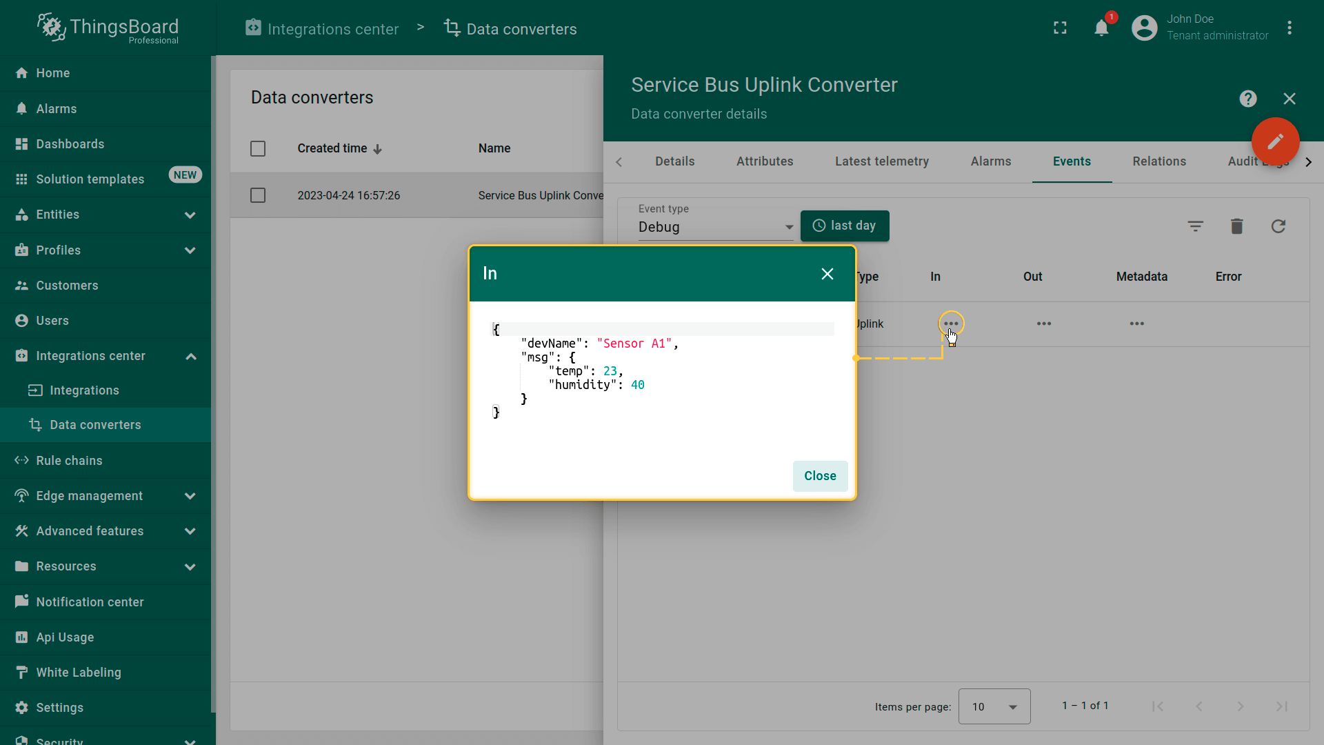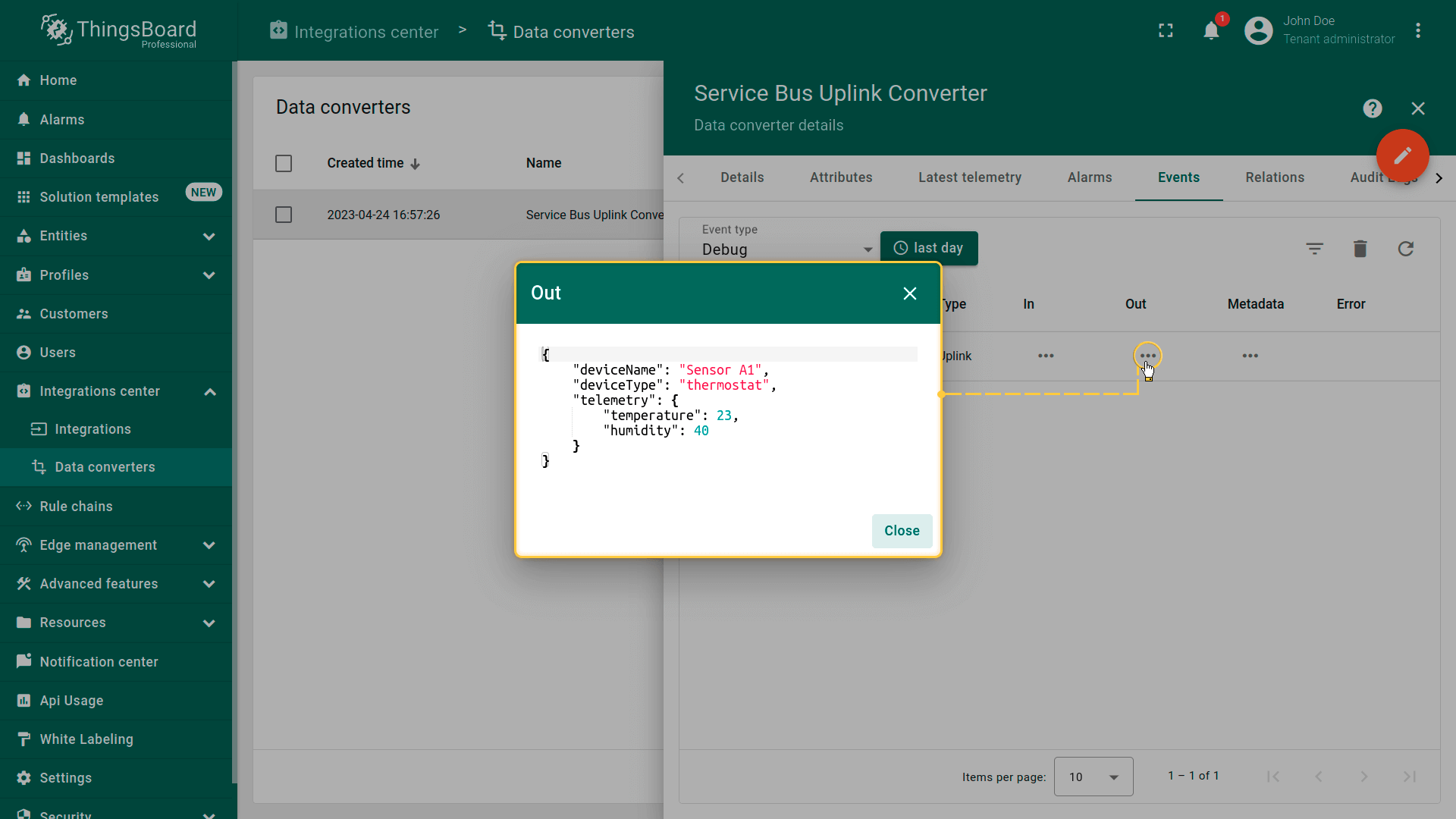 You can сreate an Uplink converter in the Data converters section or directly in the integration. Uplink is necessary in order to convert the incoming data from the device into the required format for displaying them in IoT Hub. Click on the “plus” and on “Create new converter”. To view the events, enable Debug. In the function decoder field, specify a script to parse and transform data.