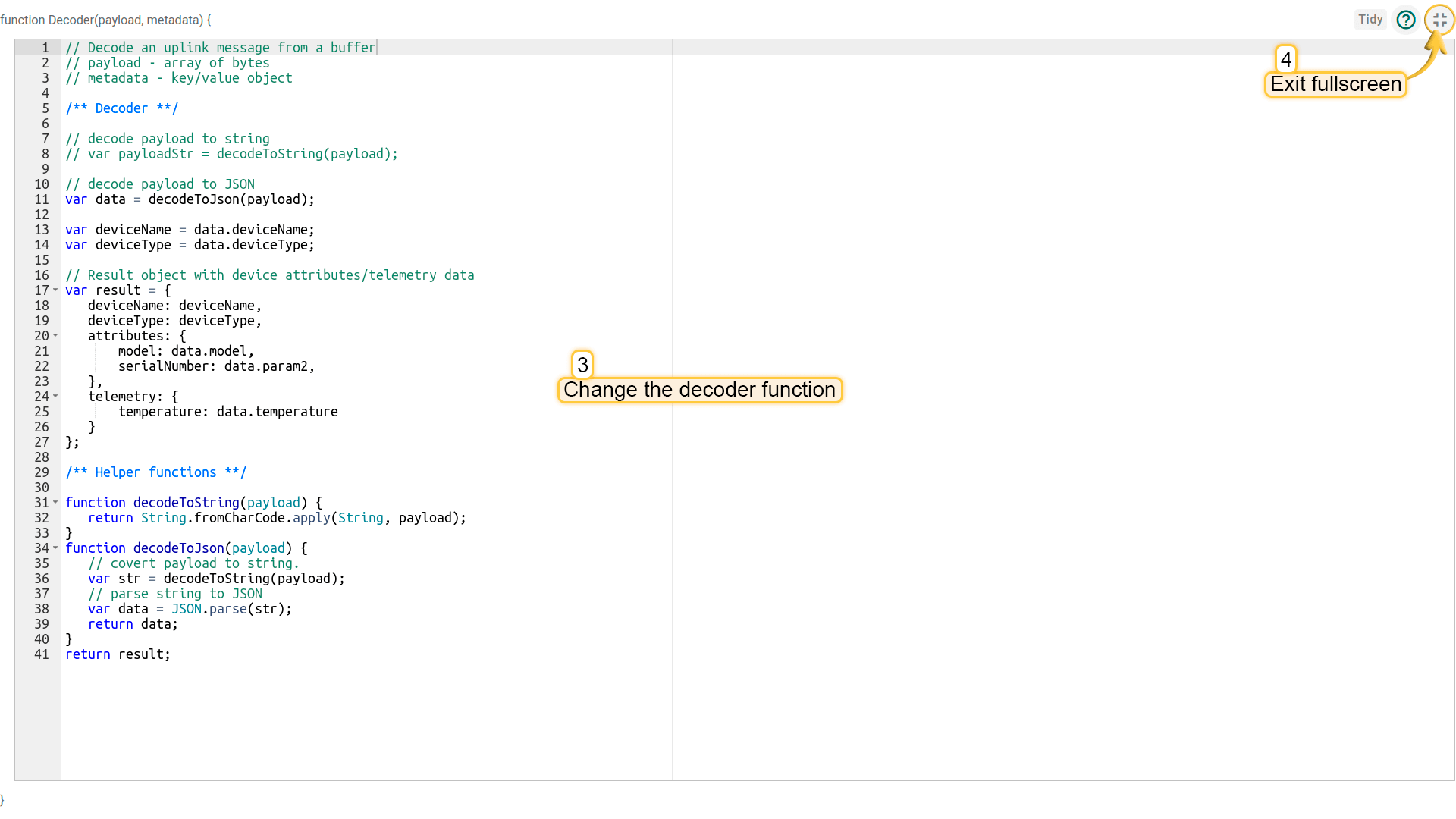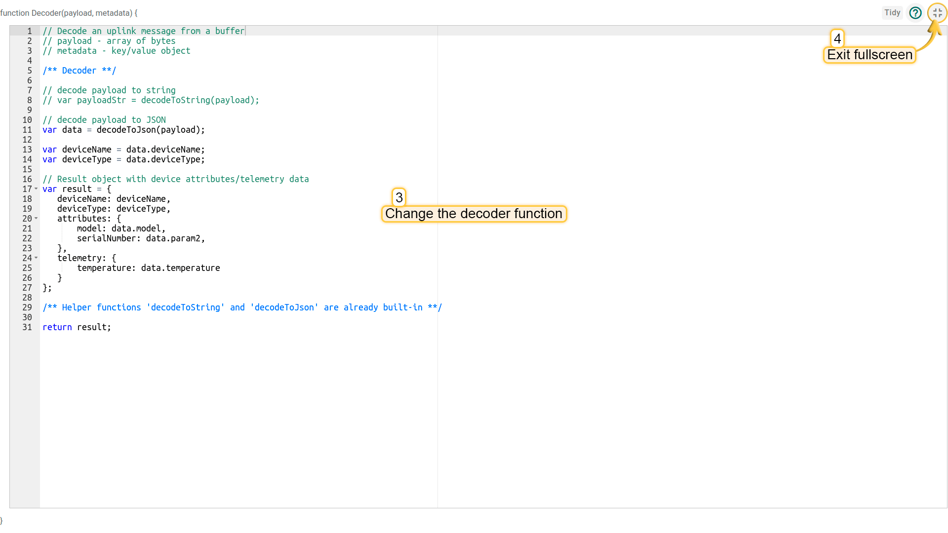 Example for the Uplink converter: You can change the decoder function while creating the converter or after creating it. If the converter has already been created, then click on the “pencil” icon to edit it. Copy the configuration example for the converter (or your own configuration) and insert it into the decoder function. Save changes by clicking on the “checkmark” icon. |