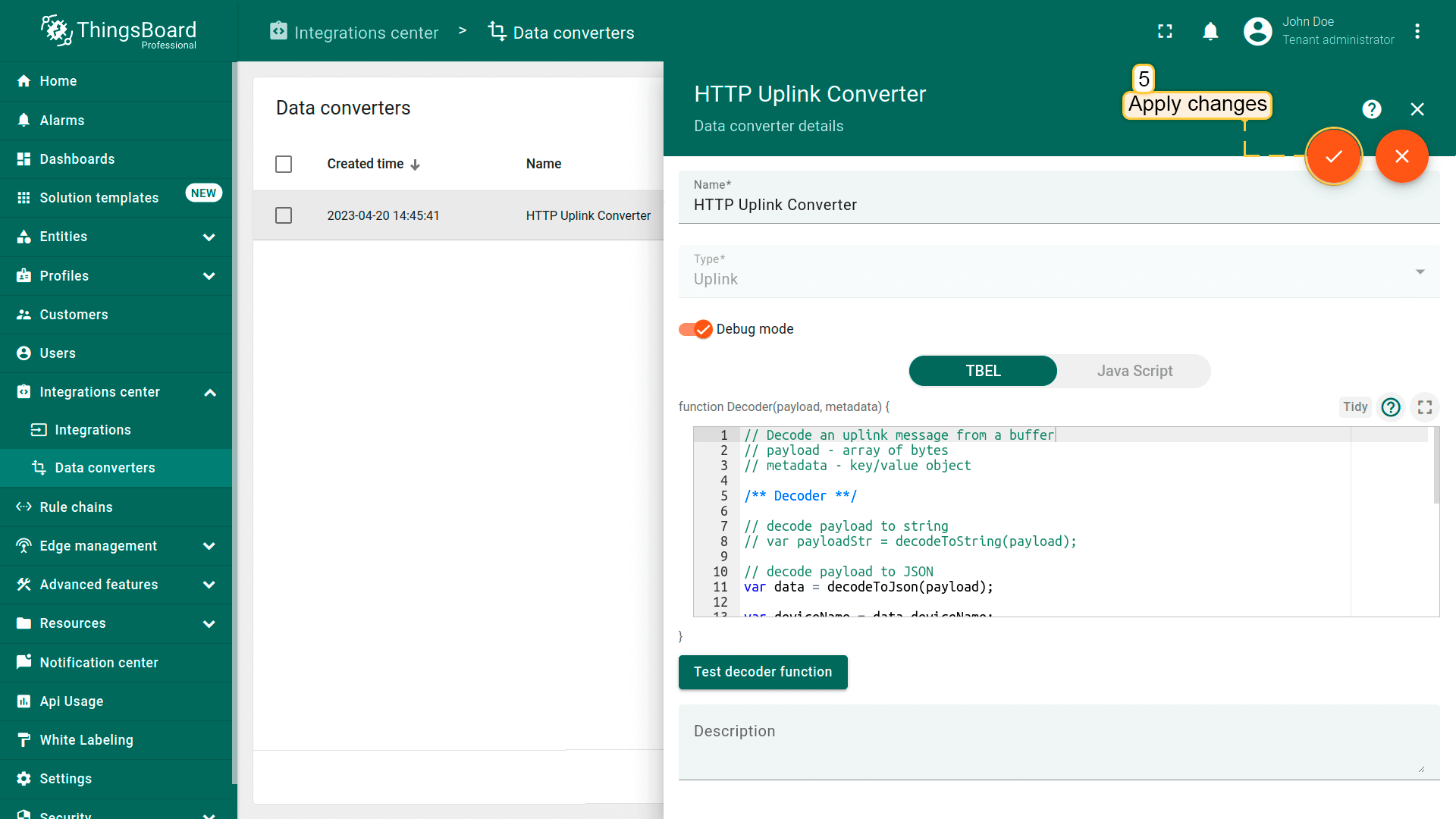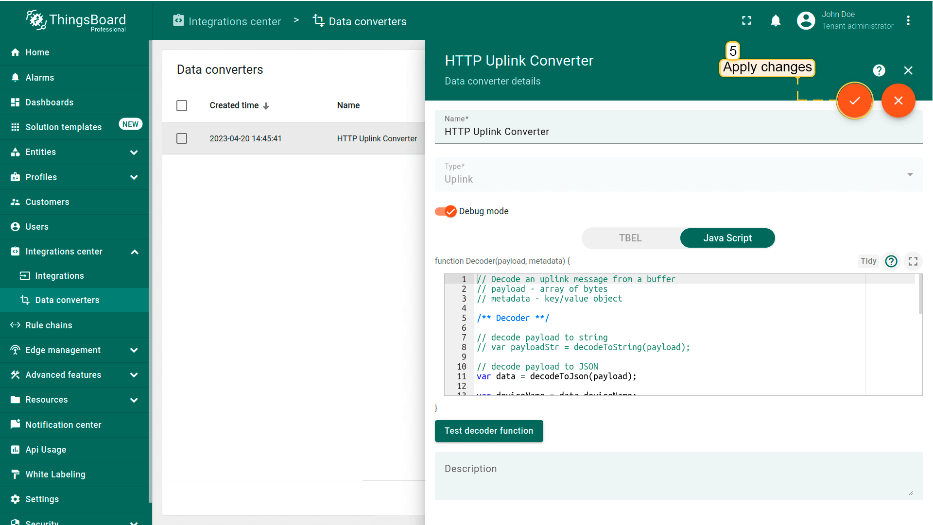 Before creating the integration, you need to create an Uplink converter in Data converters. Uplink is necessary in order to convert the incoming data from the device into the required format for displaying them in IoT Hub. Click on the “plus” and on “Create new converter”. To view the events, enable Debug. In the function decoder field, specify a script to parse and transform data.
