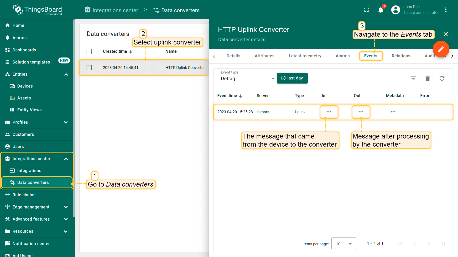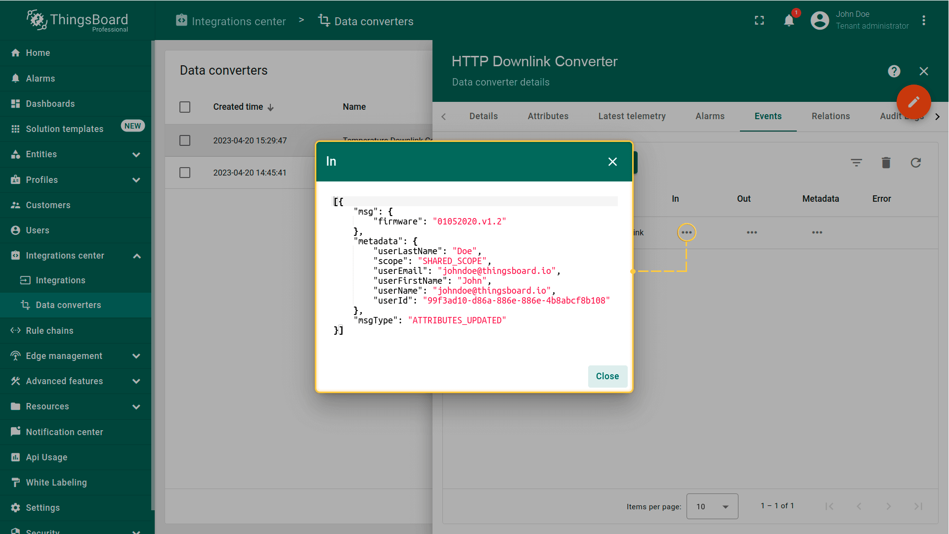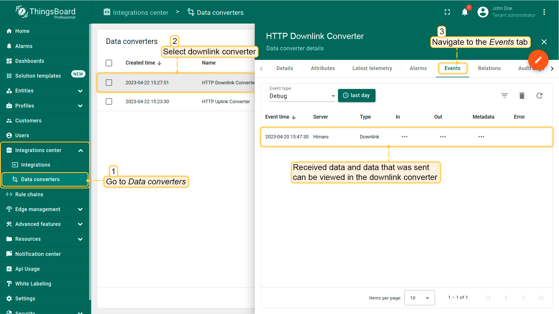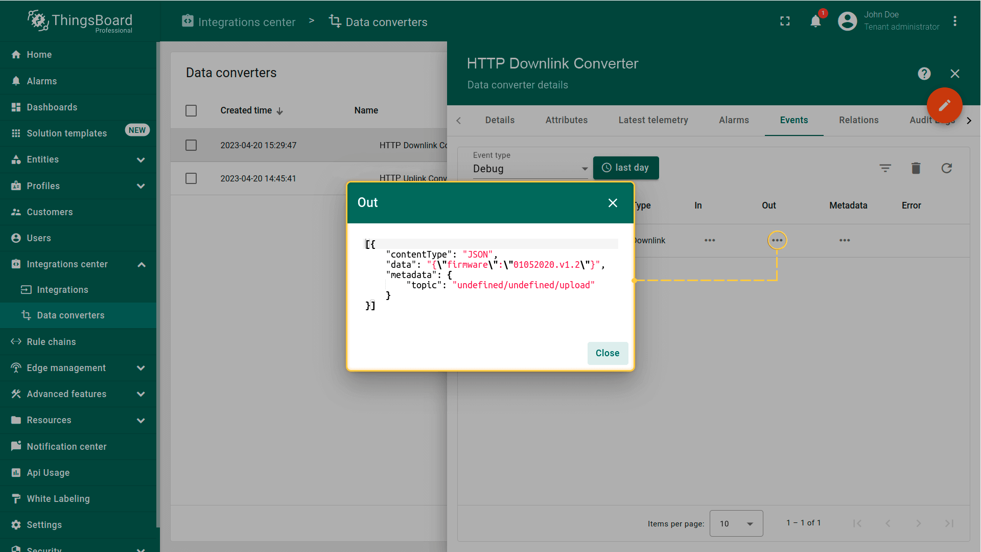 Create downlink converter in the “Data converters” page. To see events enable ‘Debug mode’.