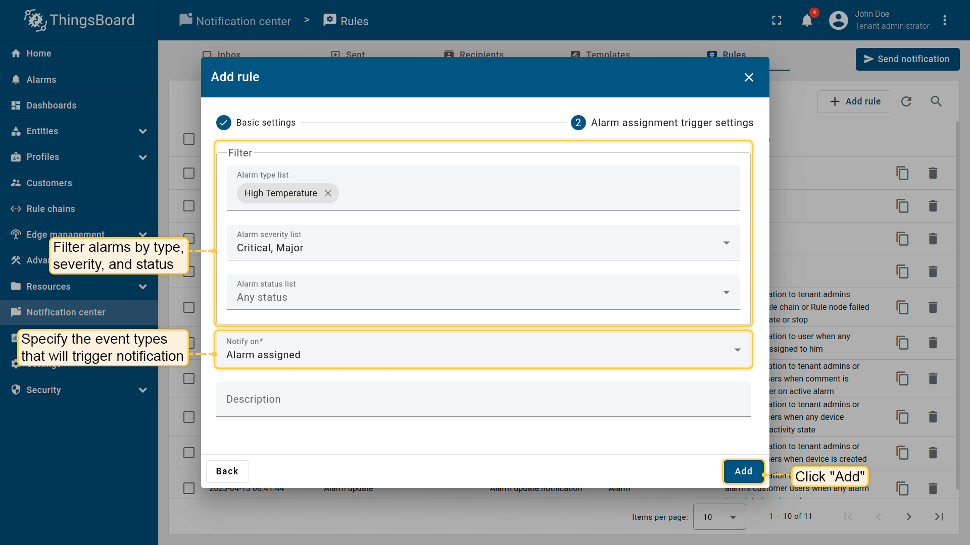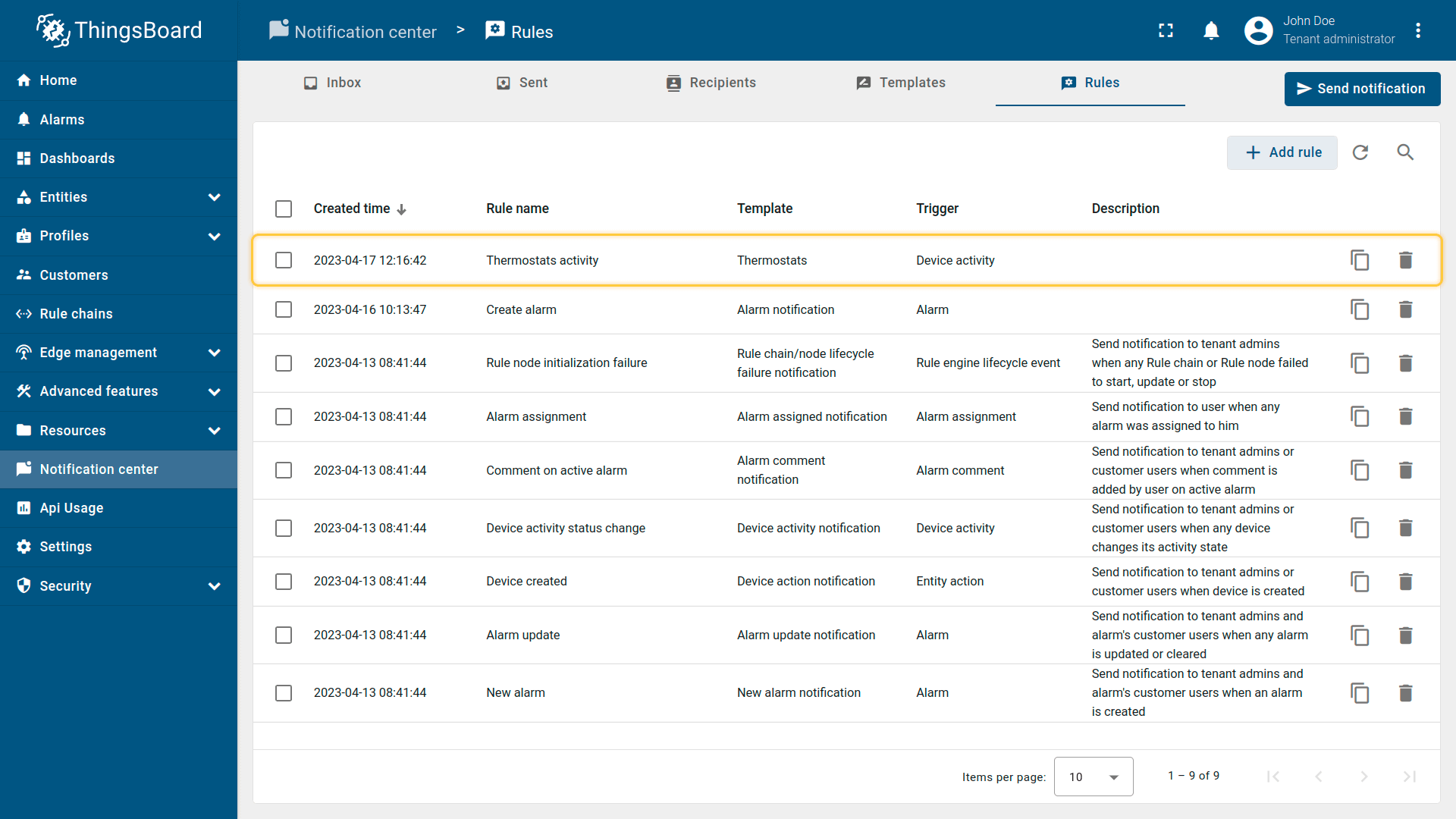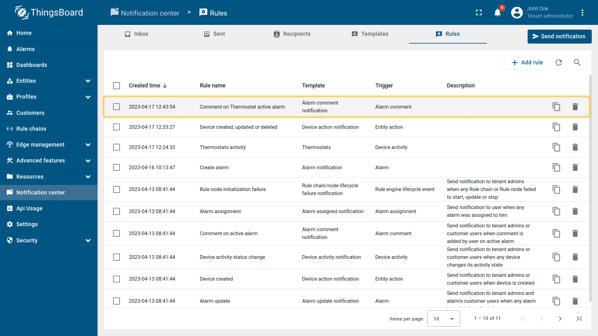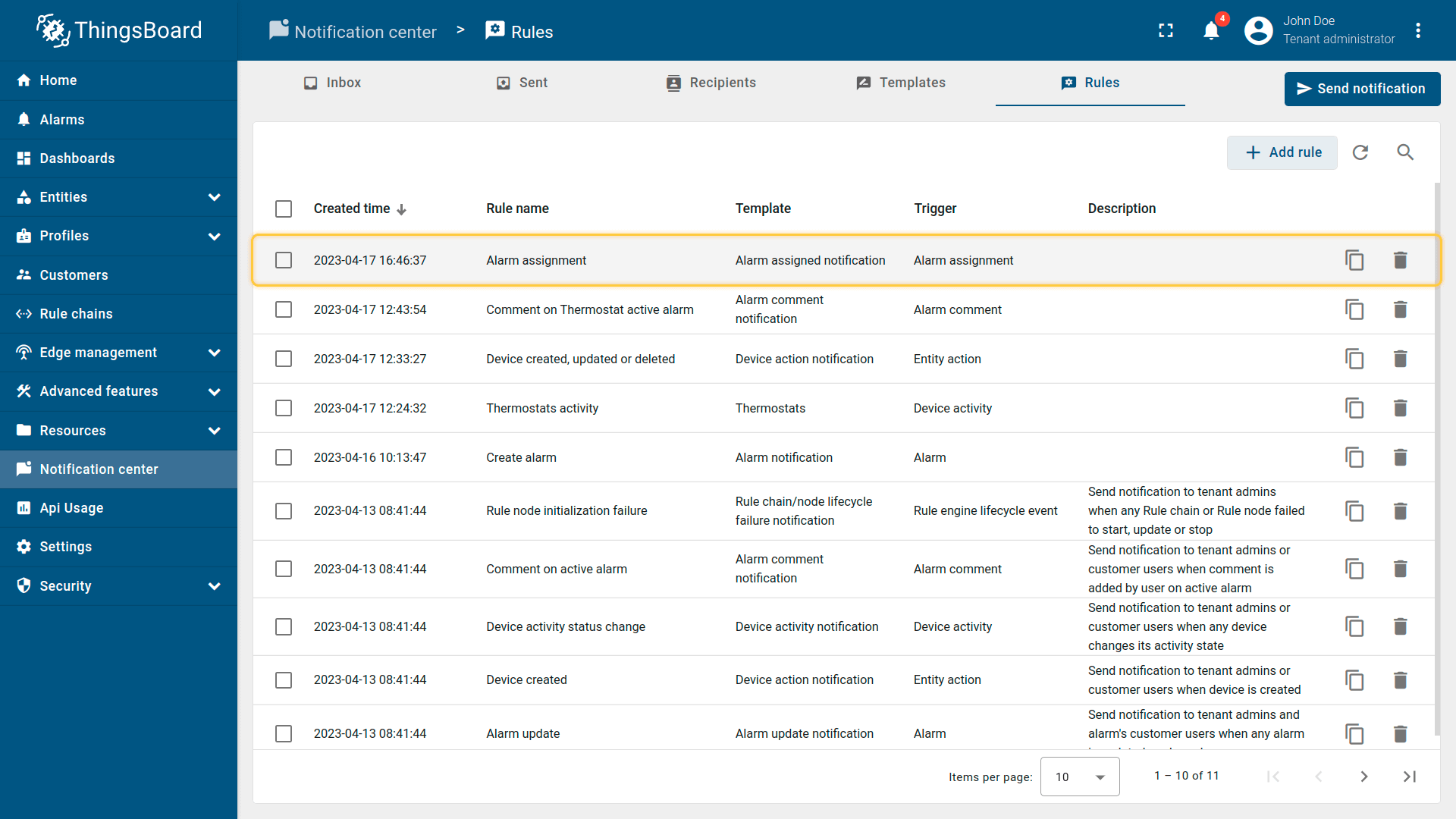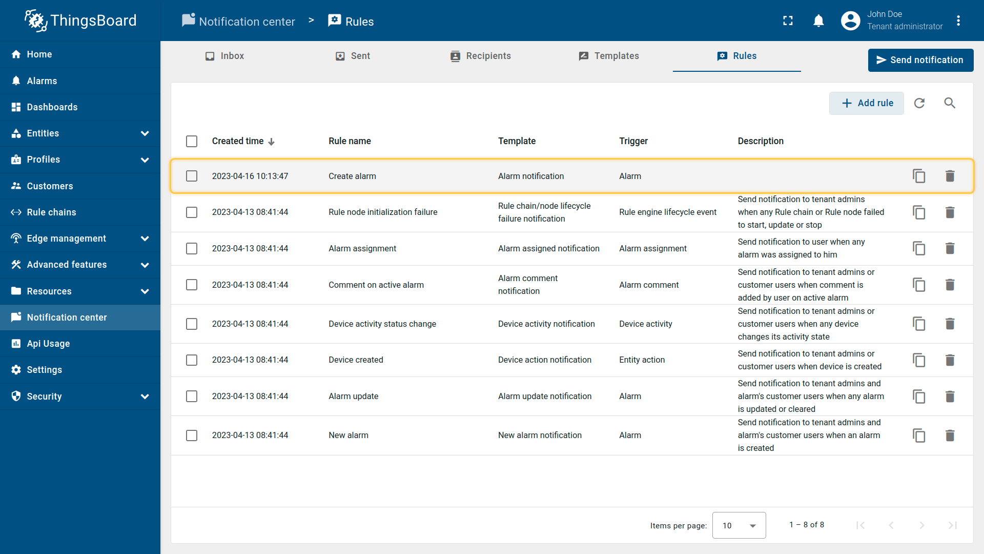 The default rule ‘New alarm’ will notify tenant administrators when an alarm is created.