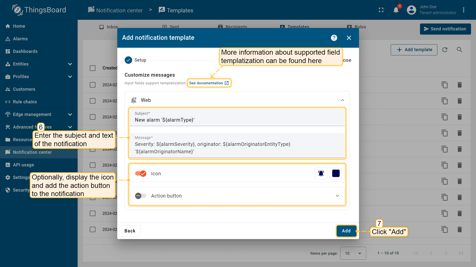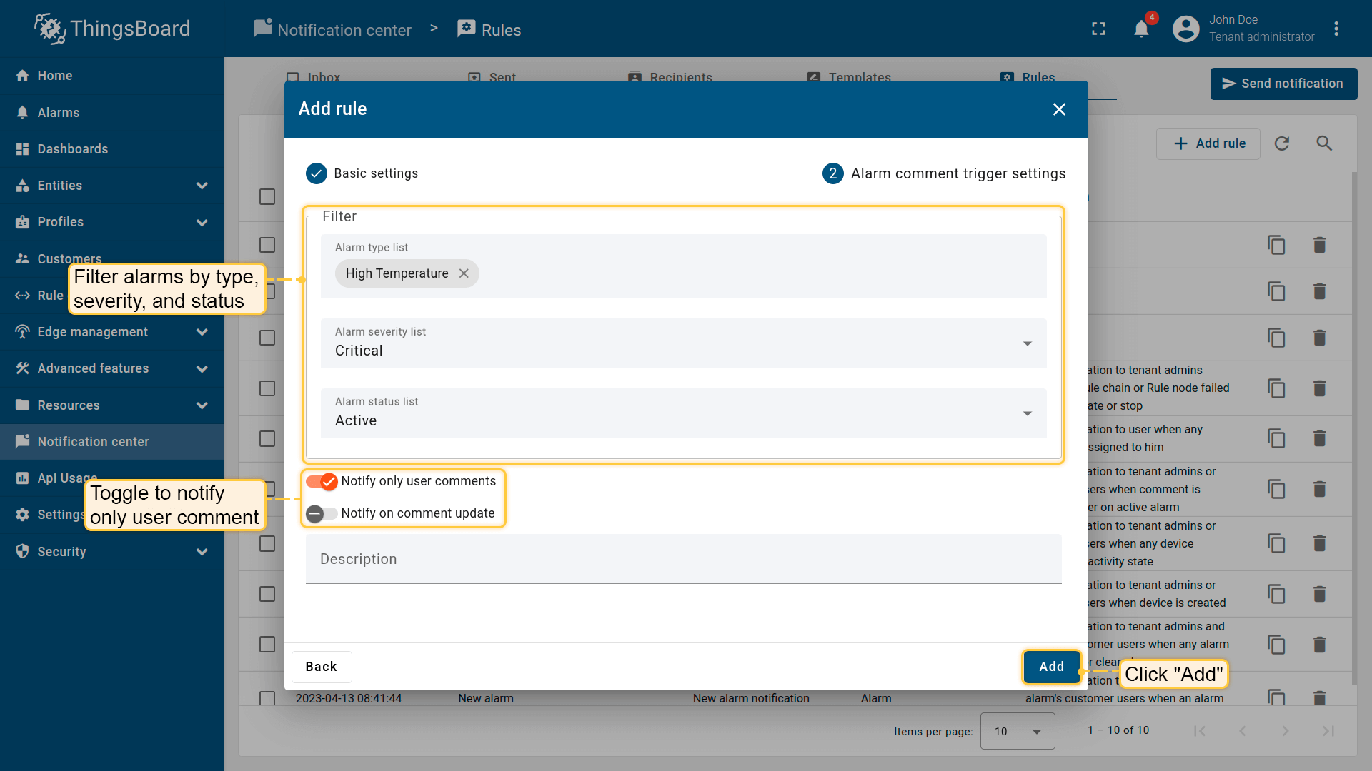 The default rule ‘Comment on active alarm’ will notify tenant administrators when comment is added by user on active alarm.