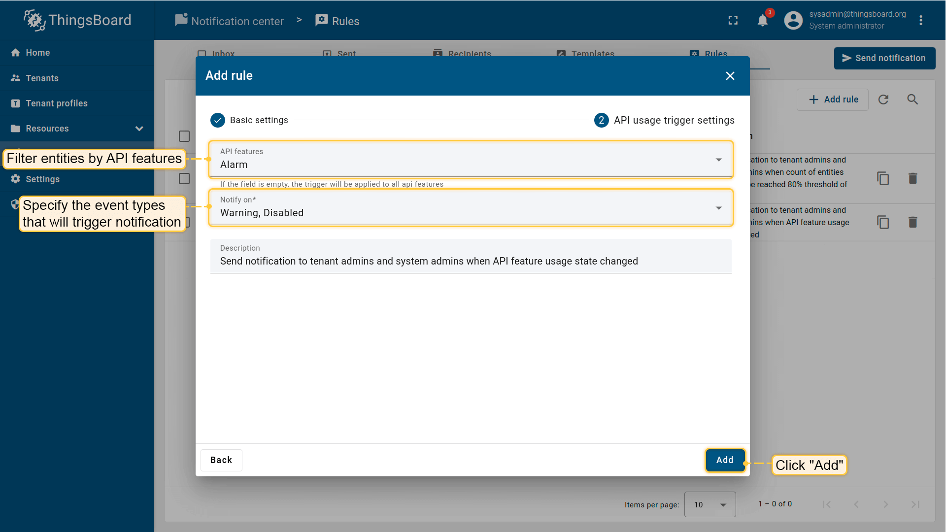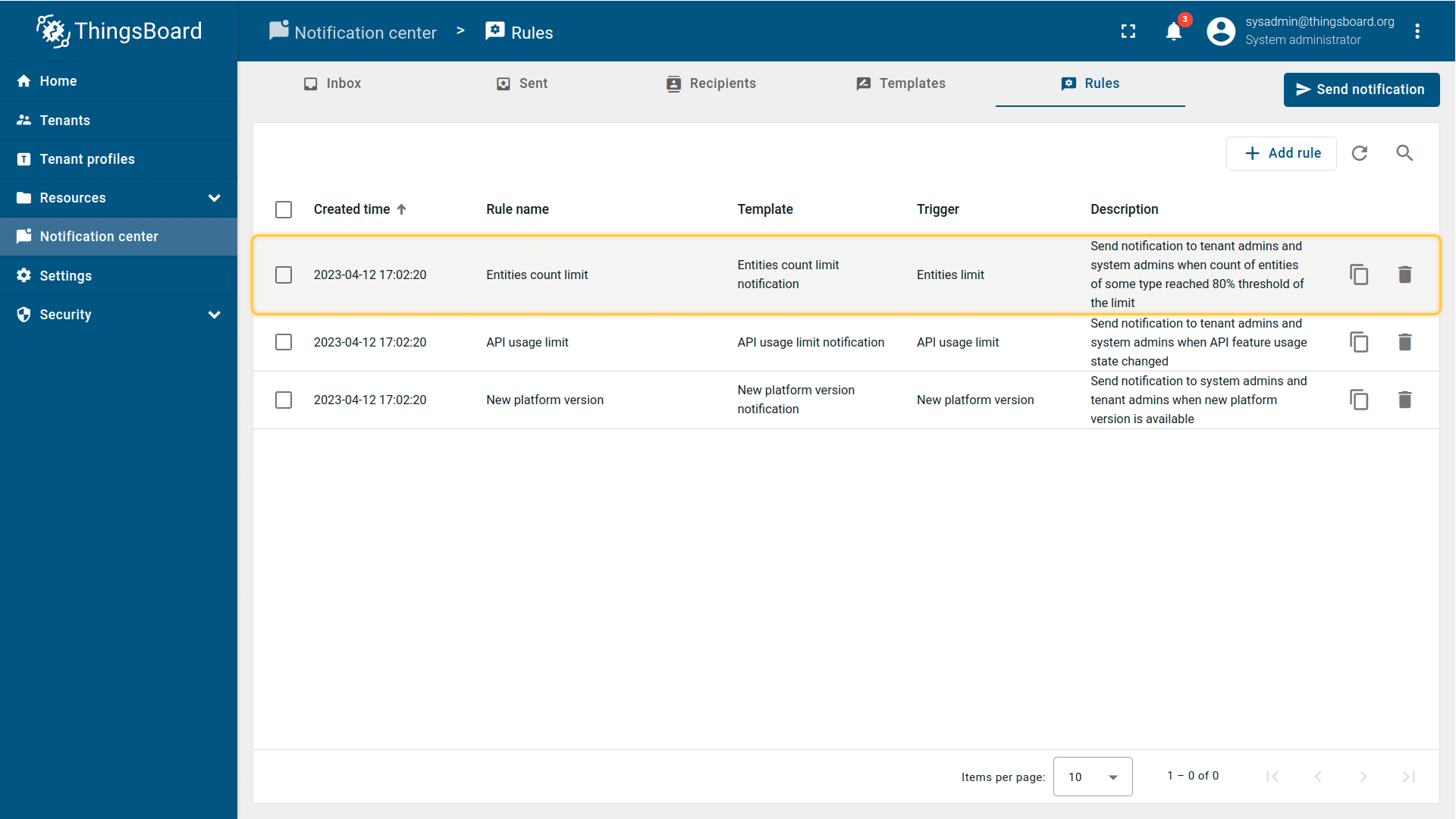 The default rule ‘Entities Limit’ will notify affected tenant administrators and system administrators when number of devices is above 80% of allowed.