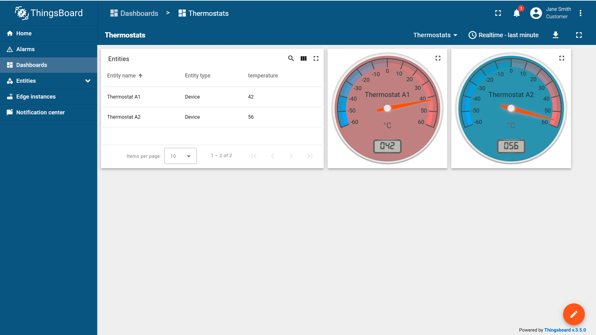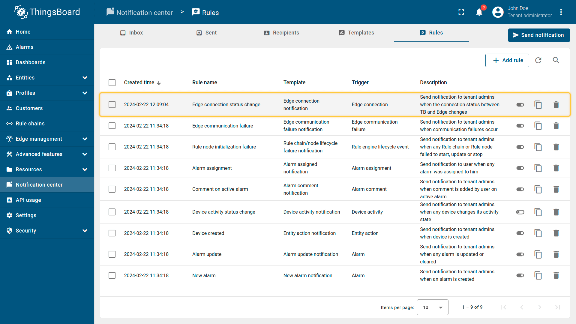 Using the “Edge connection” rule the system sends a notification to tenant admins when the connection status between TB and Edge changes.