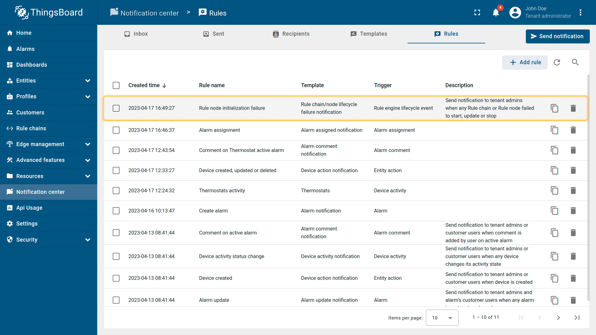 The default rule ‘Rule node initialization failure’ will notify tenant administrators when any Rule chain or Rule node failed to start, update or stop.