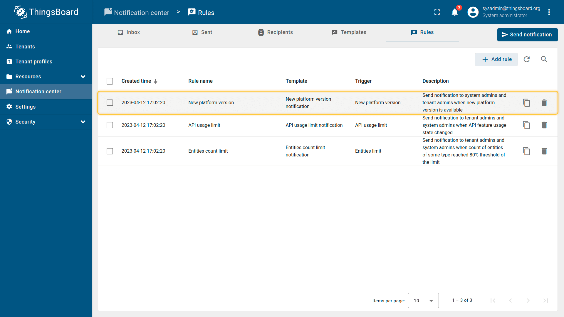 The default rule ‘New platform version’ will notify affected tenant administrators and system administrators when a new version of the IoT Hub platform is released.