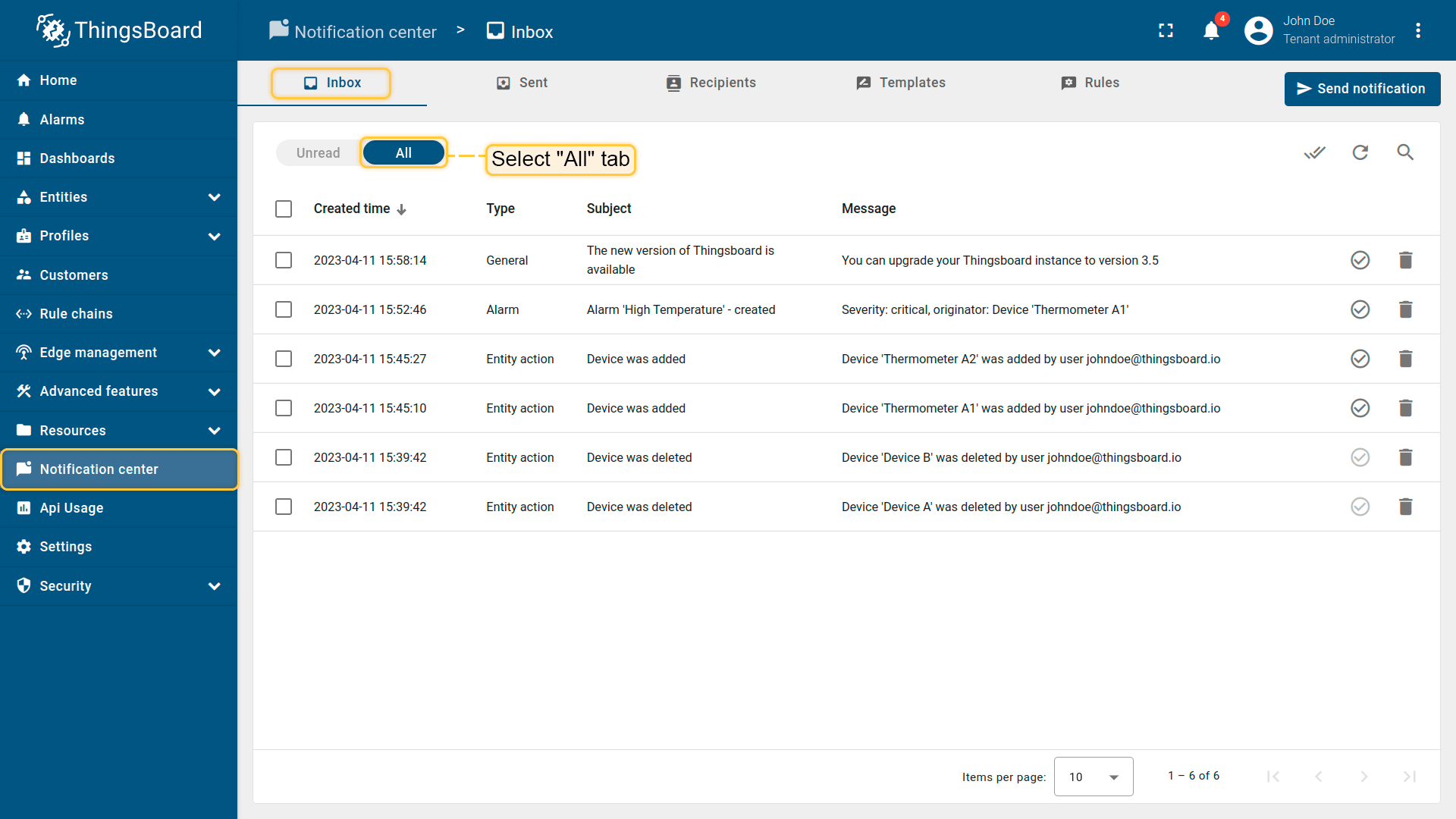 Browse your incoming notifications, mark them as read, or delete them on the “Inbox” tab. By default, only unread notifications are displayed. To view all notifications, switch to the “All” tab in the incoming notifications table.