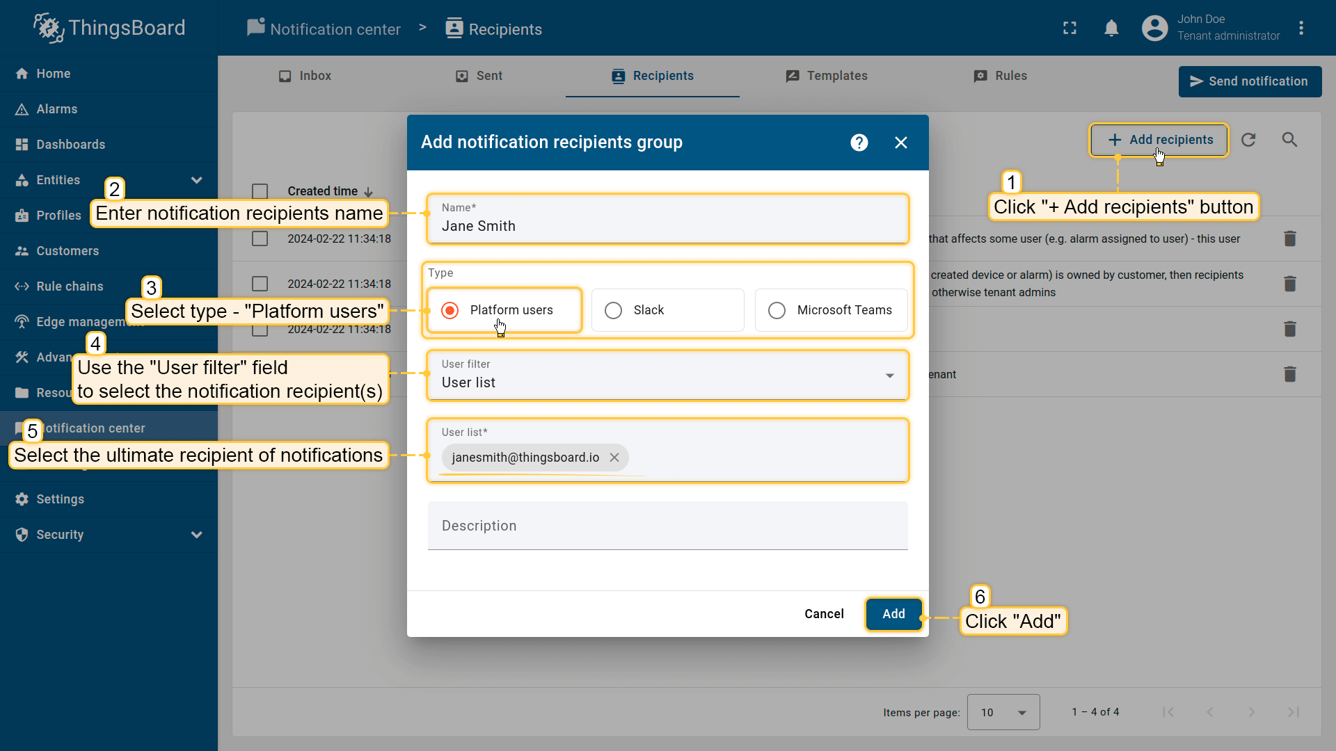 In the “Recipients” tab, you’ll find a list of configured notification recipients. You can add, edit existing, and delete notification recipients as needed. Recipients can be added based on their roles, individual user accounts, predefined groups, etc.