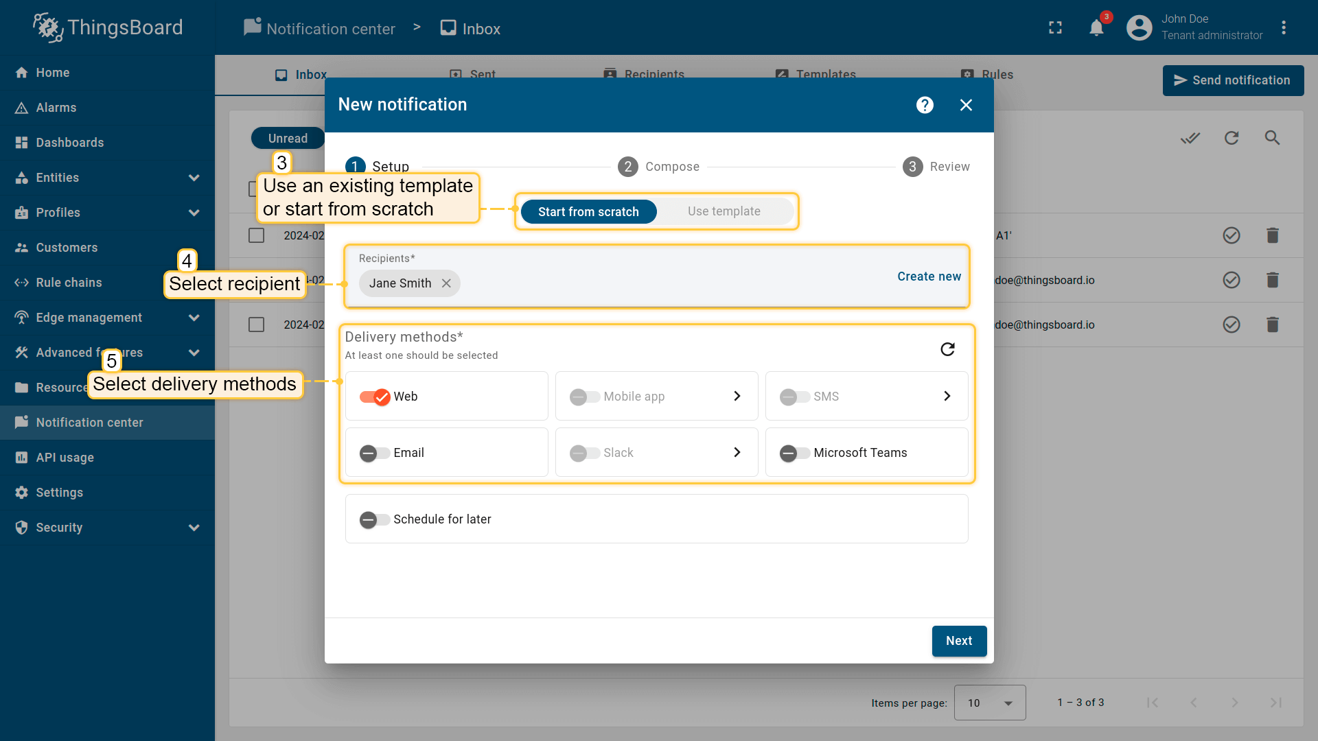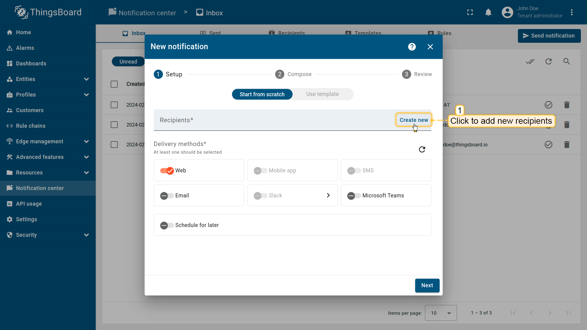 - Select recipients and one or more delivery methods. In this example, let's consider the Web delivery method;