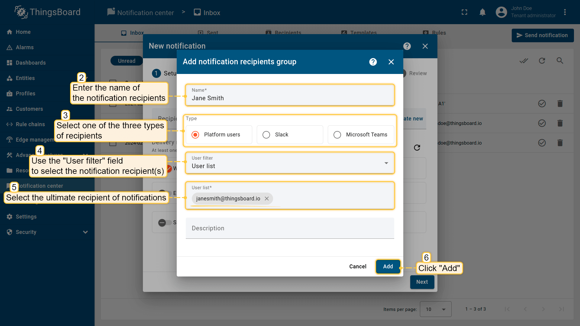 - A new window will pop up. Here, type in the name of the notification recipient(s);