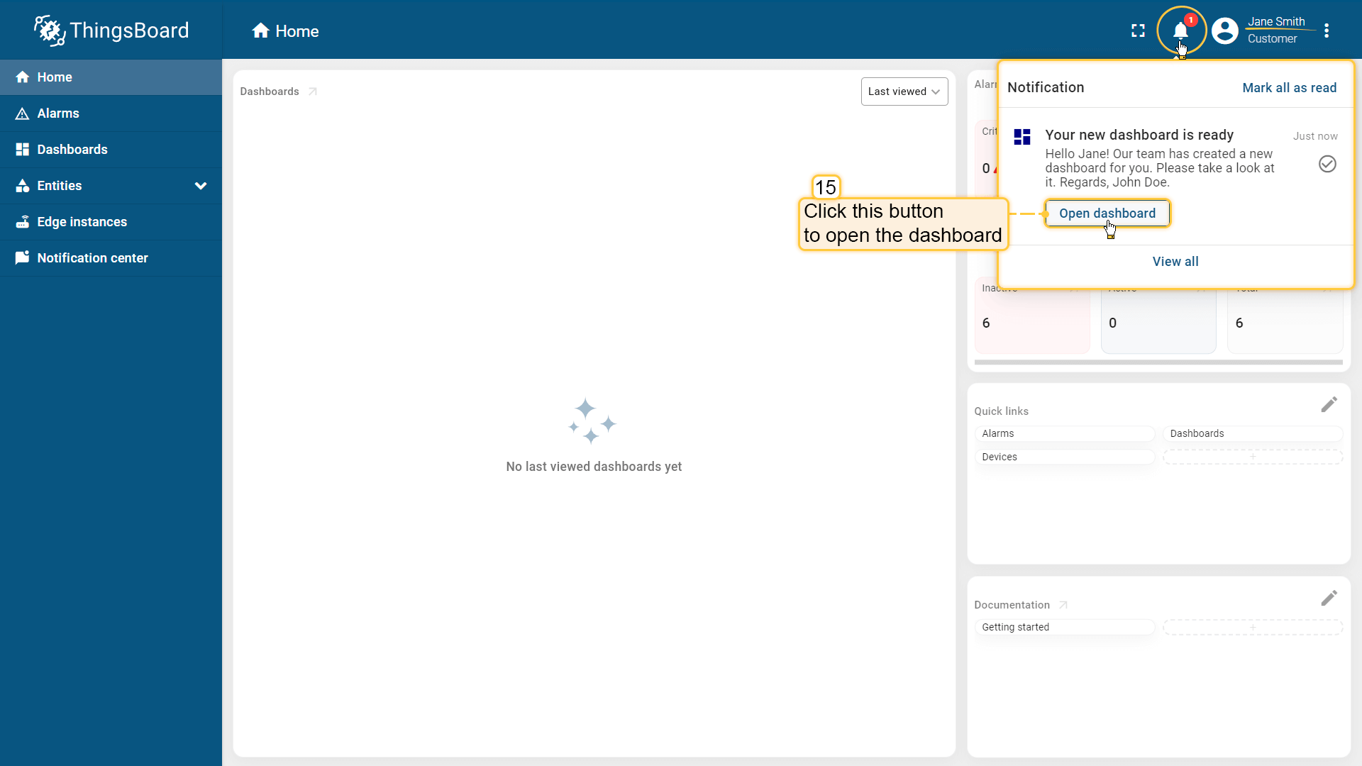 - By clicking on the "Open this dashboard" button in the message, the user will open the dashboard window.