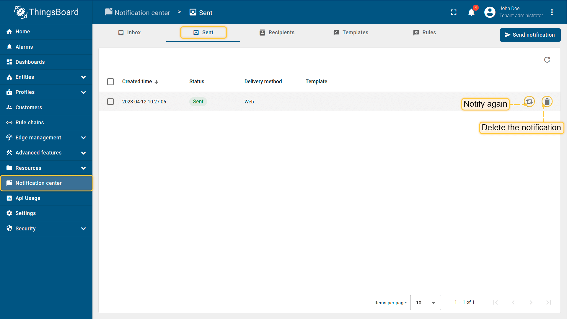 To resend a notification, click on the “Notify again” icon in the row of the corresponding notification. You can also delete notifications by clicking the “delete” icon.