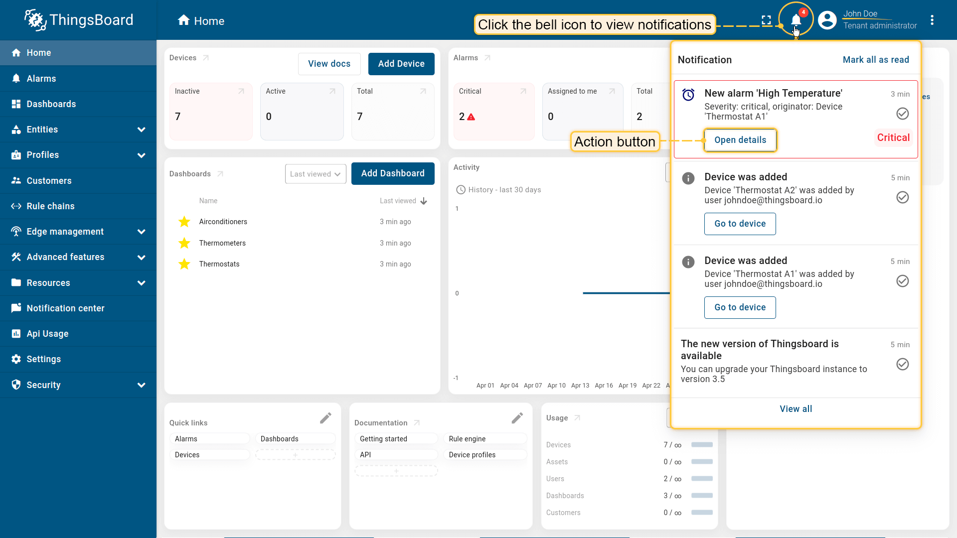 The default rule ‘Device activity status change’ will notify tenant admins when any device changes its activity state