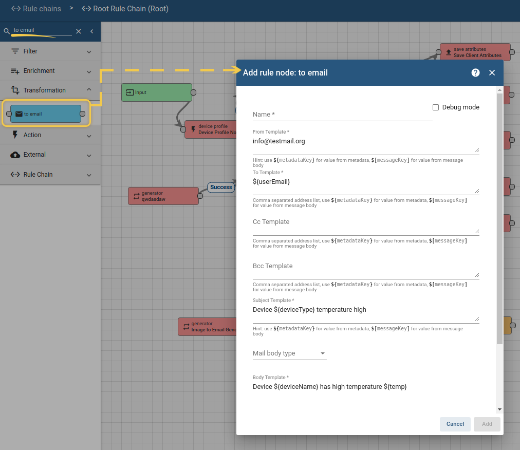 Find and configure new send email node and connect all nodes between themselves, like on the screen shoot. Save rule chain.