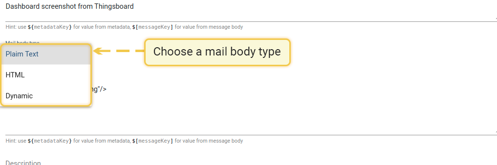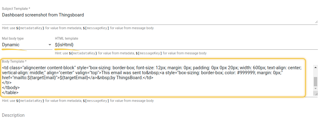 to emailnode and drag it to the canvas. - Specify: Name, From Template, To Template - we will use pattern to find an email in data of message, Subject Template. Select Mail Body Type HTML or Dynamic. We will use the Dynamic.