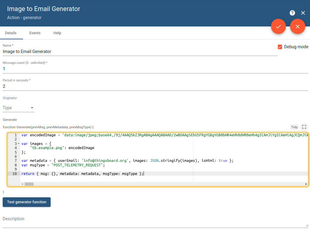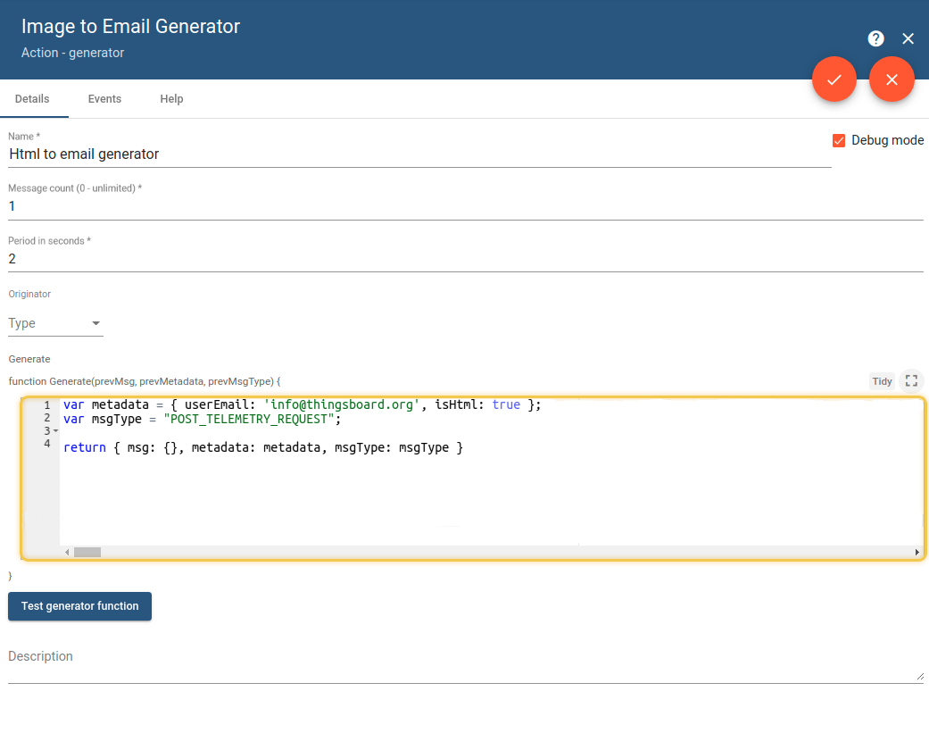 - Like a start point we will use Generator that will imitate regular rule chain messages flow: prepared message and metadata where we can contain some dynamic field for to email node.
