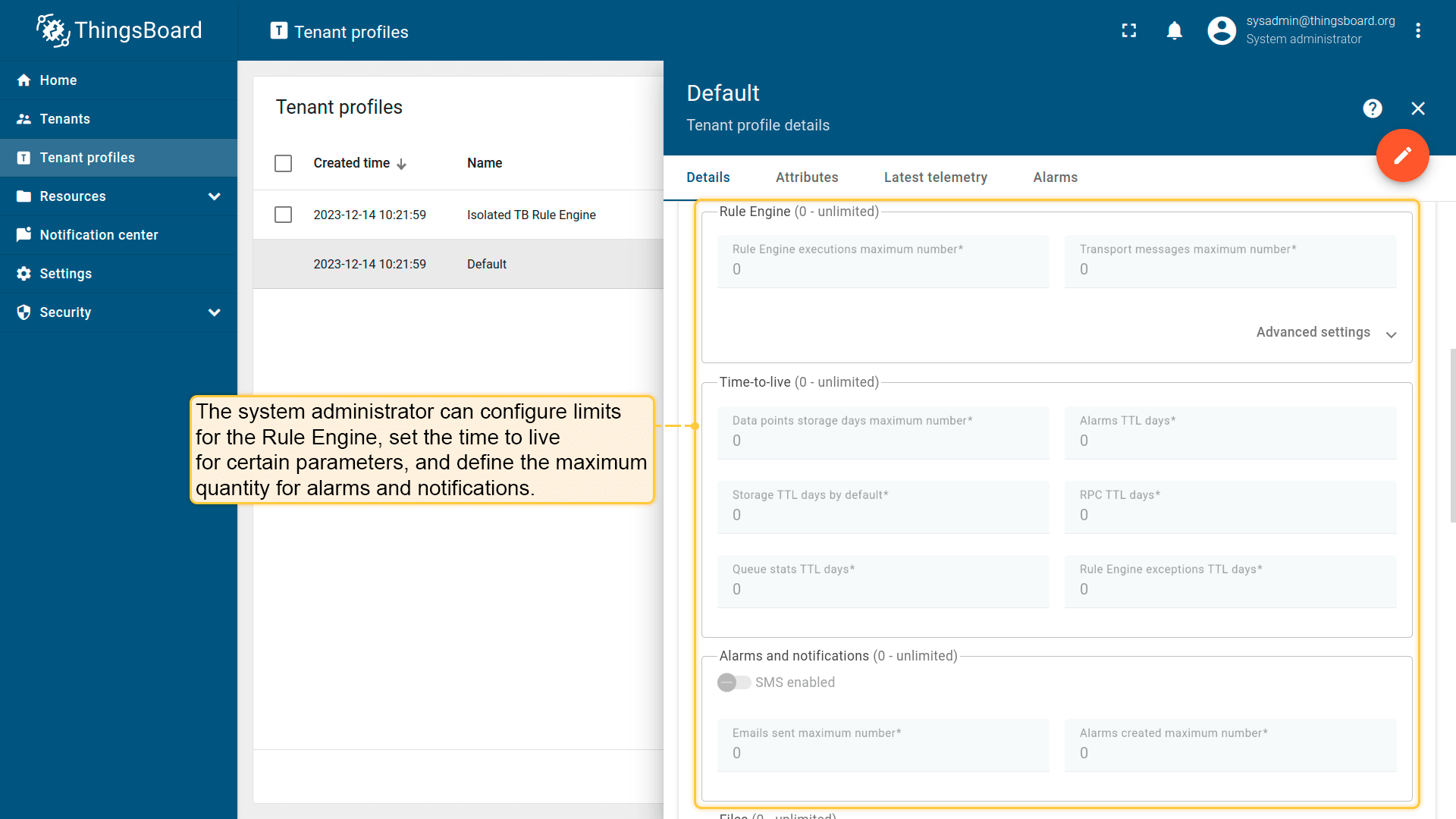 These settings allow the system administrator to configure limitations on the number of entities created by a tenant, set limits on the maximum number of messages, API calls, per month, configure the maximum number of requests the platform should process for a specific device (device-level) or for all devices belonging to a single tenant (tenant-level), etc.