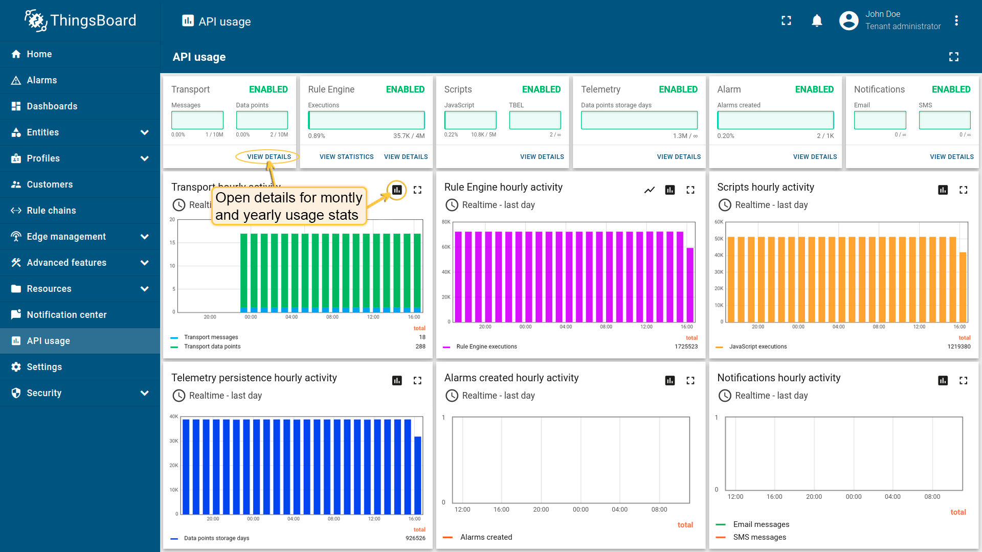 IoT Hub tracks API usage for six main components: Transport, Rule Engine, JS functions, Telemetry persistence, Email, and SMS services. The platform will disable the component if one of the related API Limits reaches a threshold. For example, if Tenant devices produce more than 100M messages per a month, the platform will disable all connections for devices that belong to this Tenant. When the API usage is disabled or reaches a certain threshold (typically 80%) IoT Hub will notify the Tenant Administrator via email.