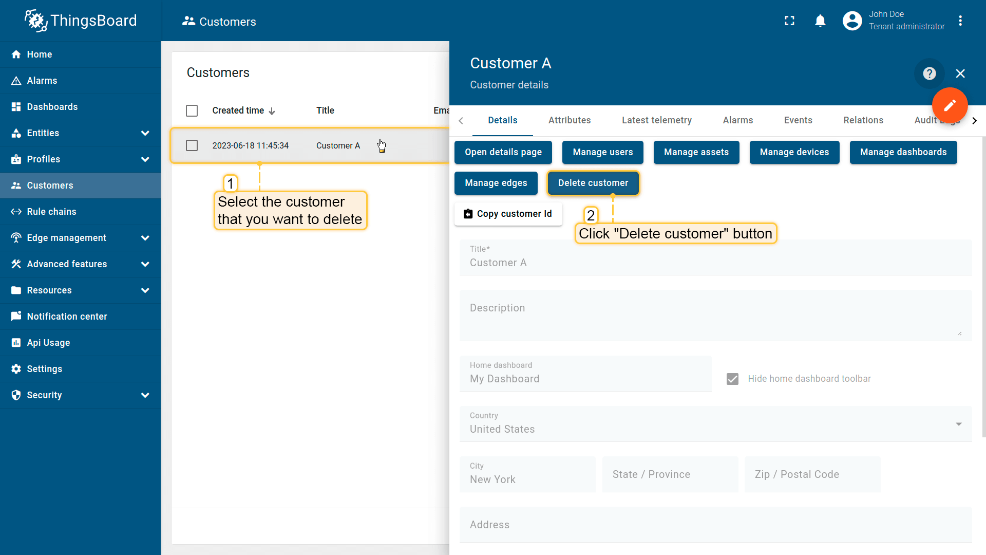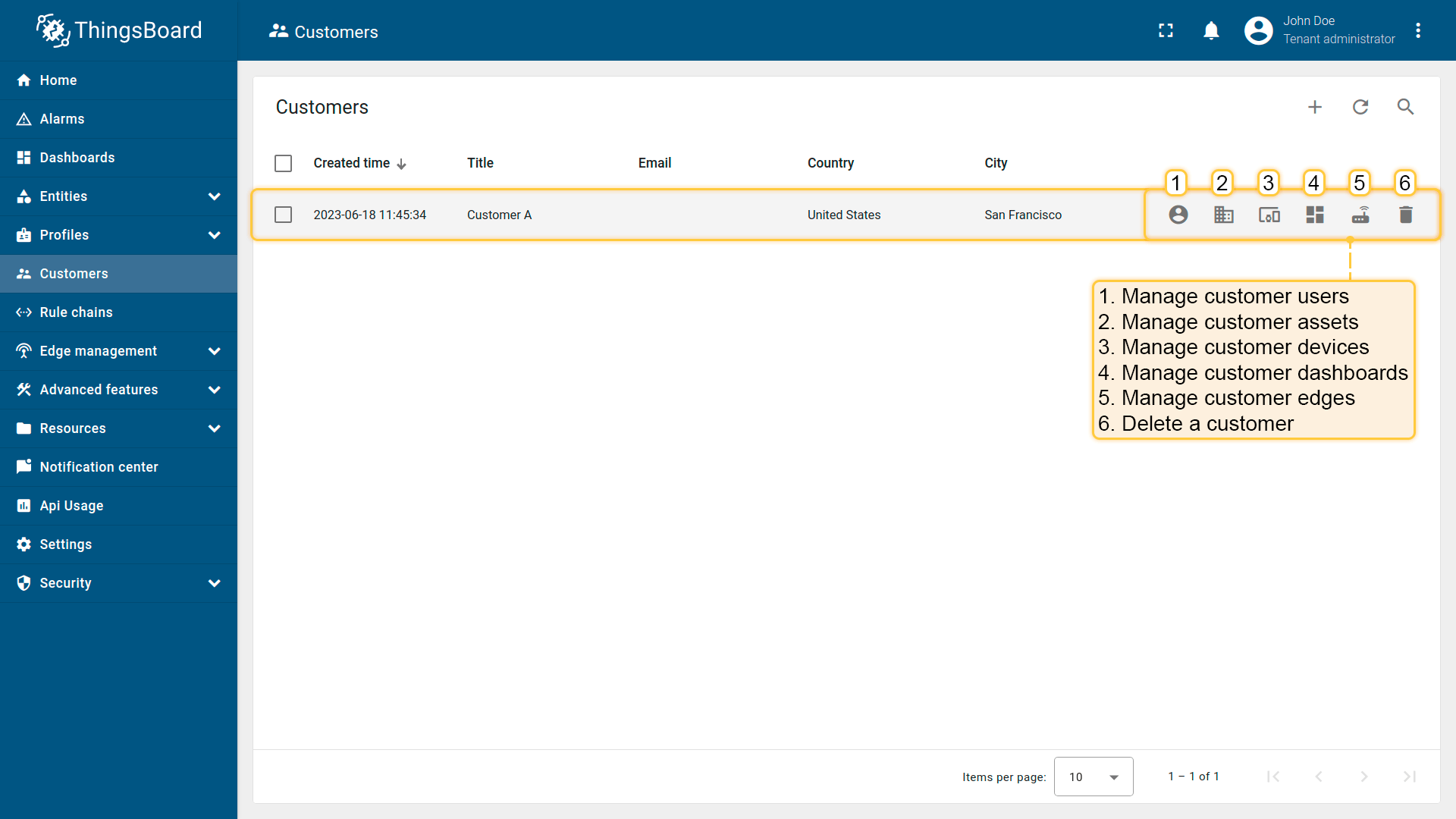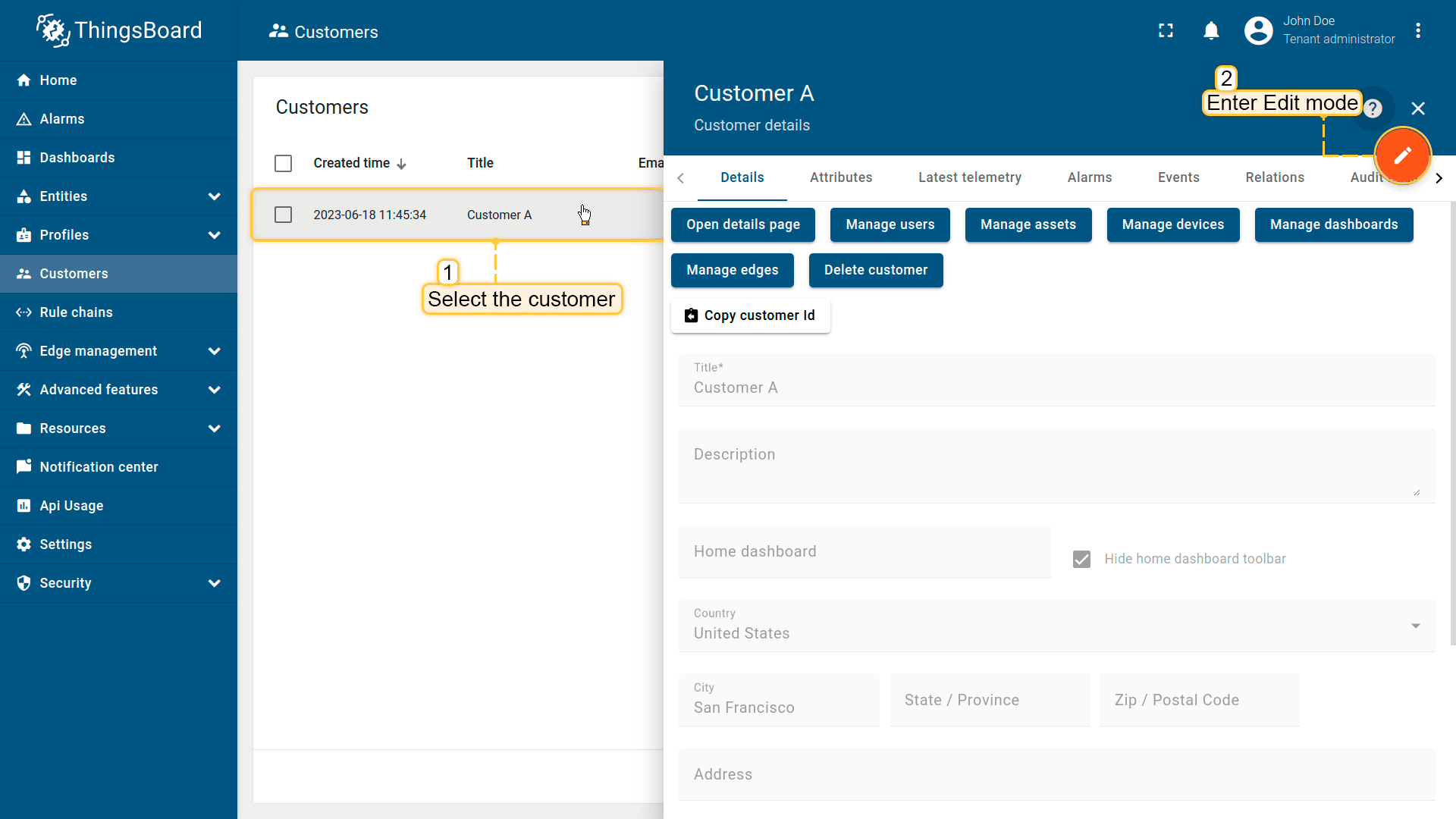 Tenant administrators can create customer and can directly manage their assets, devices, dashboards, and edges from the customer details page by clicking the related tab.