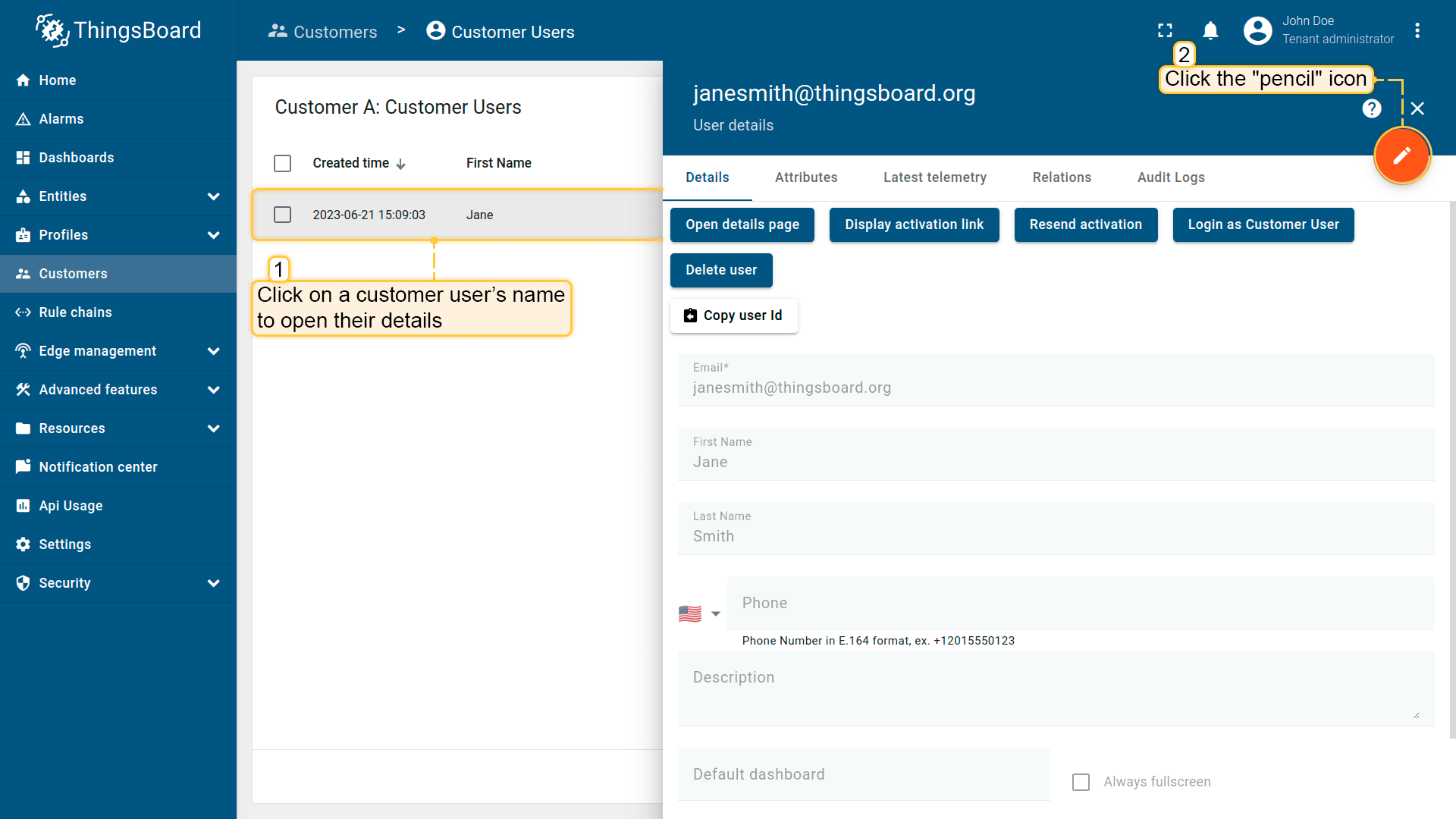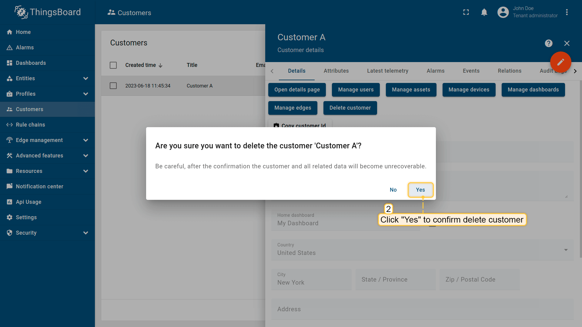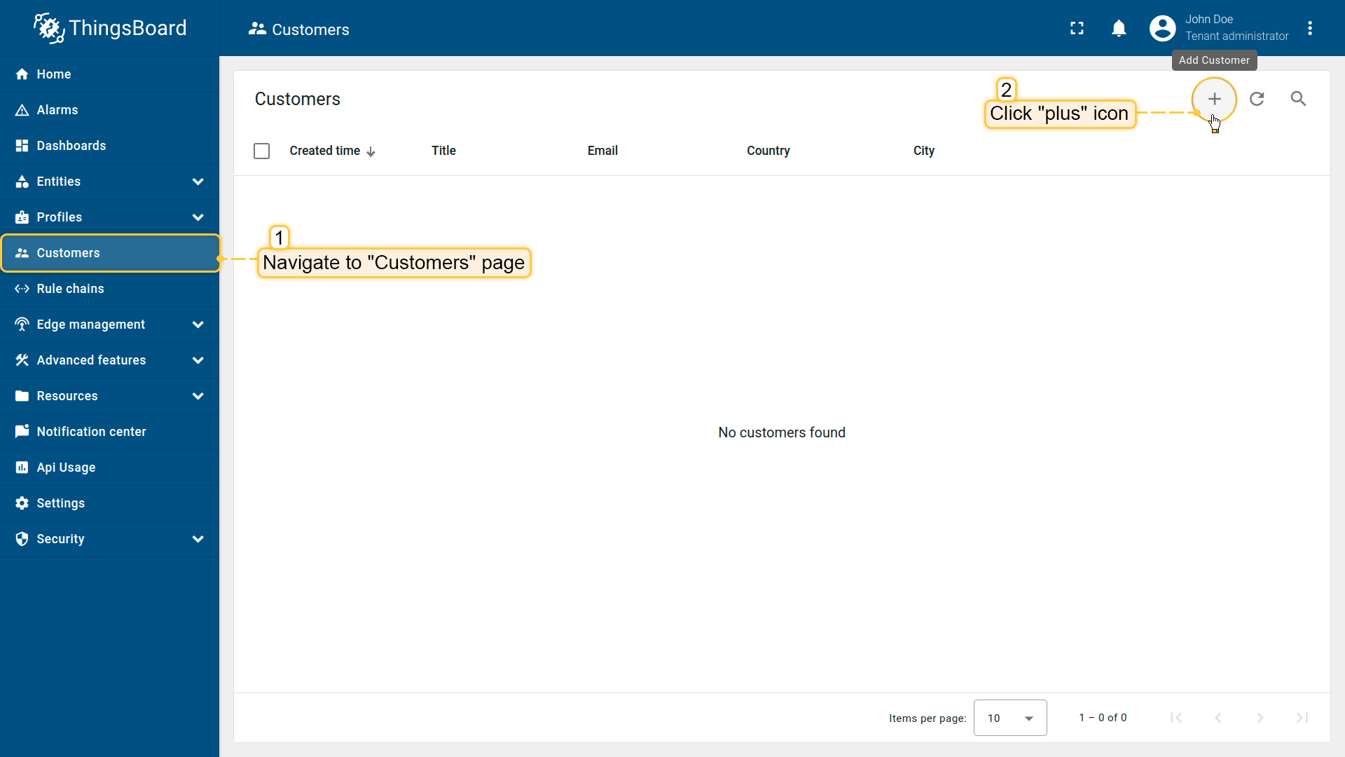 Tenant administrators can create customer and can directly manage their assets, devices, dashboards, and edges from the customer details page by clicking the related tab.