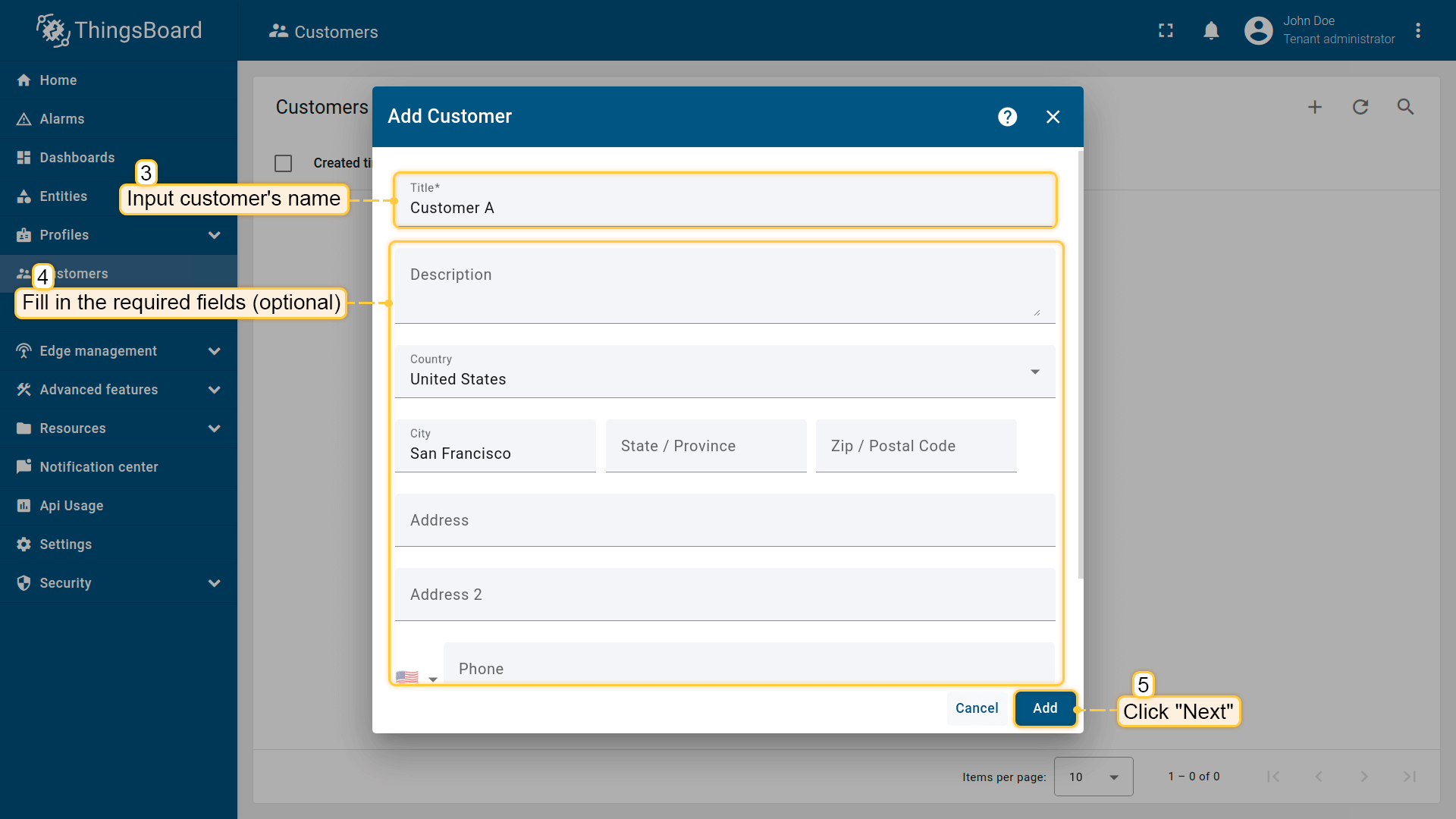 - In the opened dialog box, fill in the title of the customer. Also, you can optionally indicate country name, city, address, and phone number. Then click "Add";