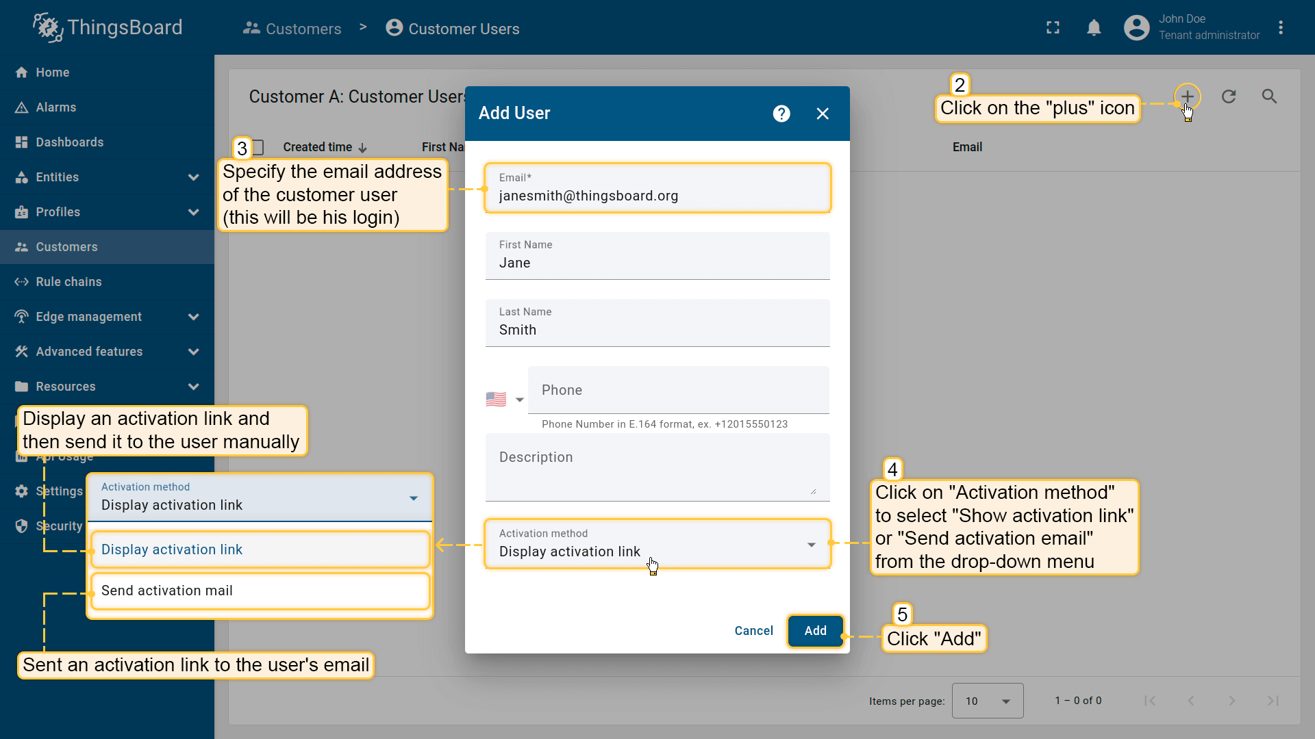 - Click the plus sign in the upper right corner of the screen. In the opened dialog box, enter the email address, first and last name of the user. Then choose activation method: display activation link or send activation link via email. Then click "Add";