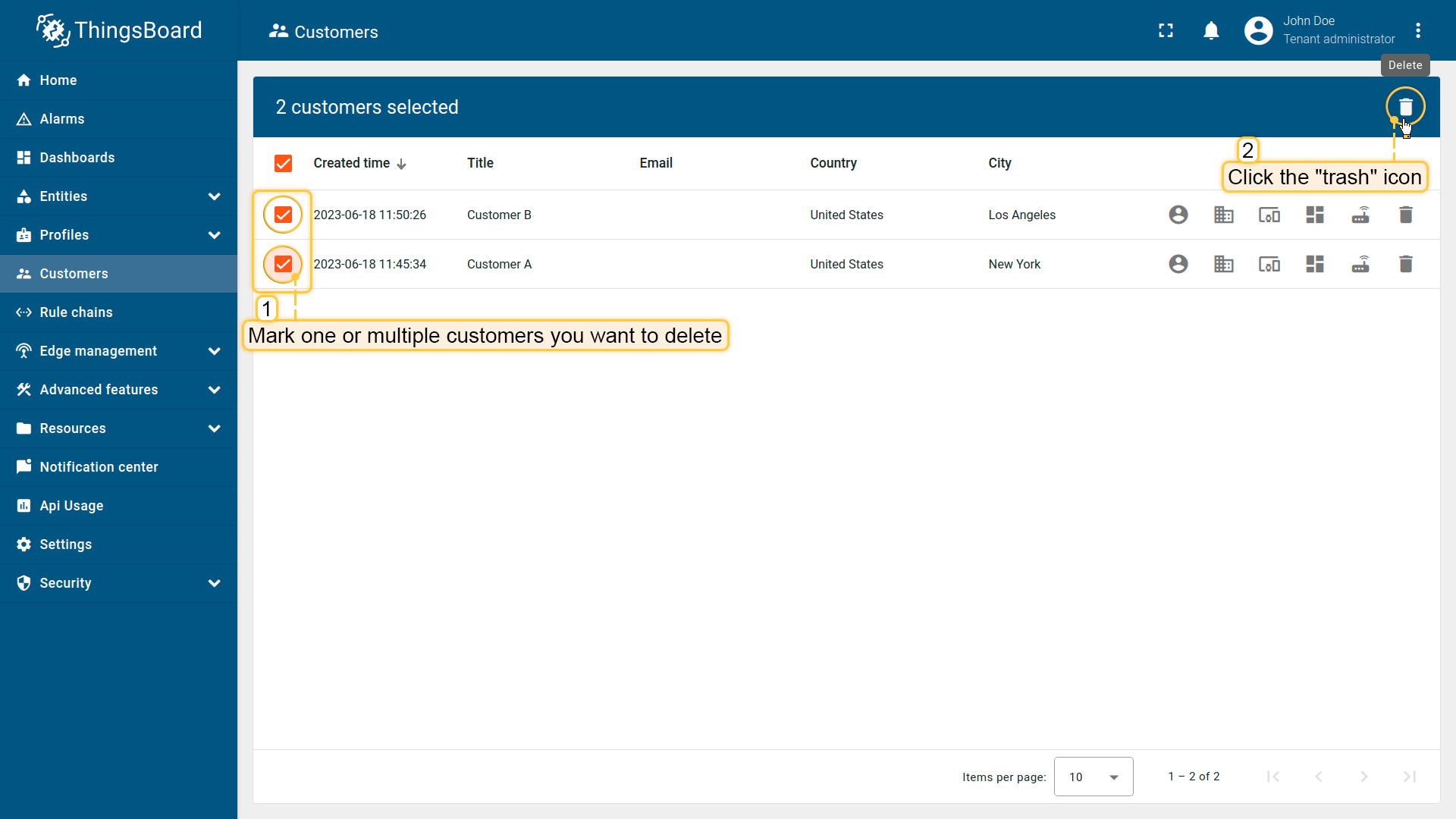 The tenant administrator can delete a customer along with all its customer users using one of the following ways: