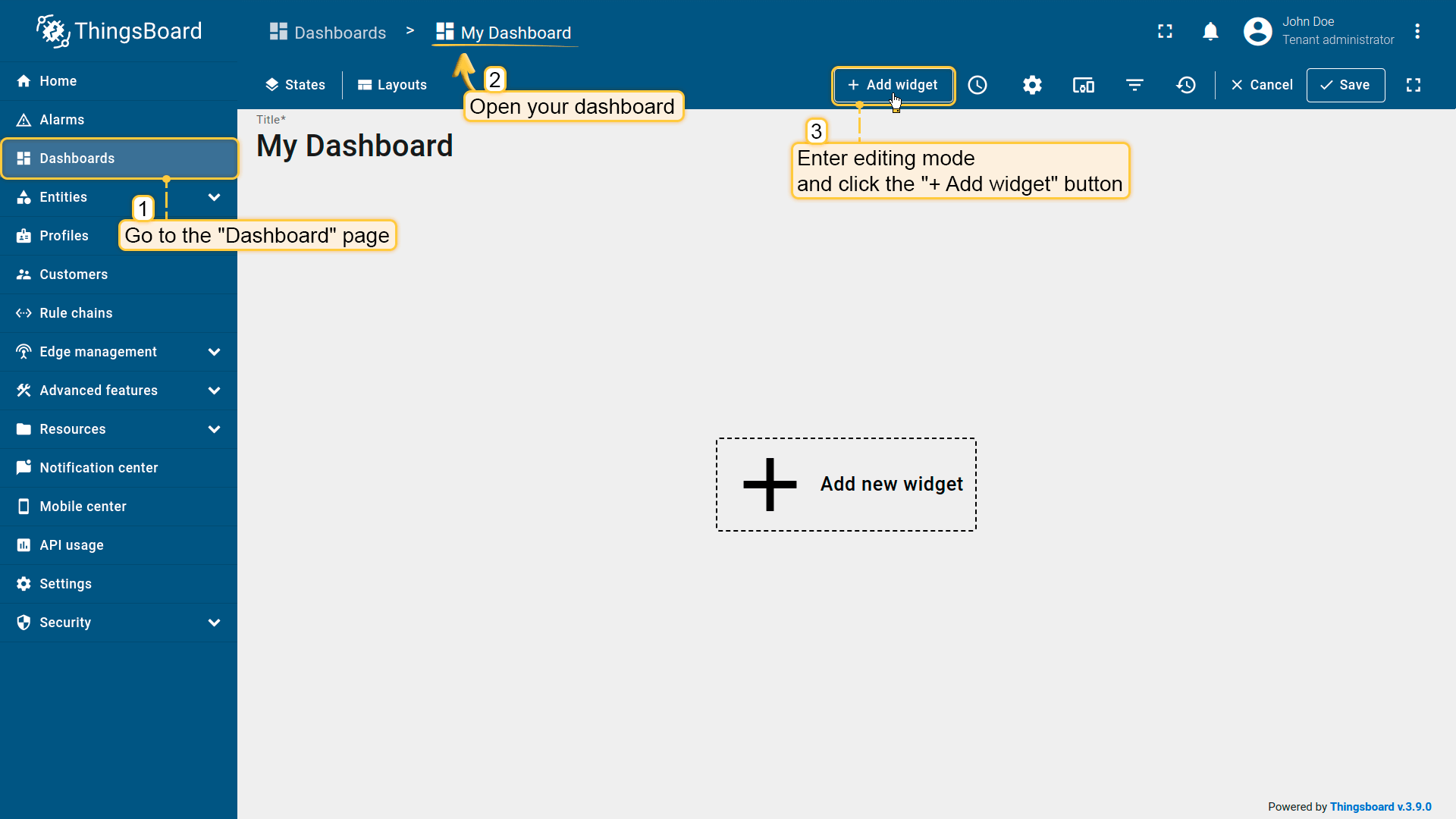 - Open your dashboard and switch to edit mode. Click the "+ Add widget" icon at the top of the screen;