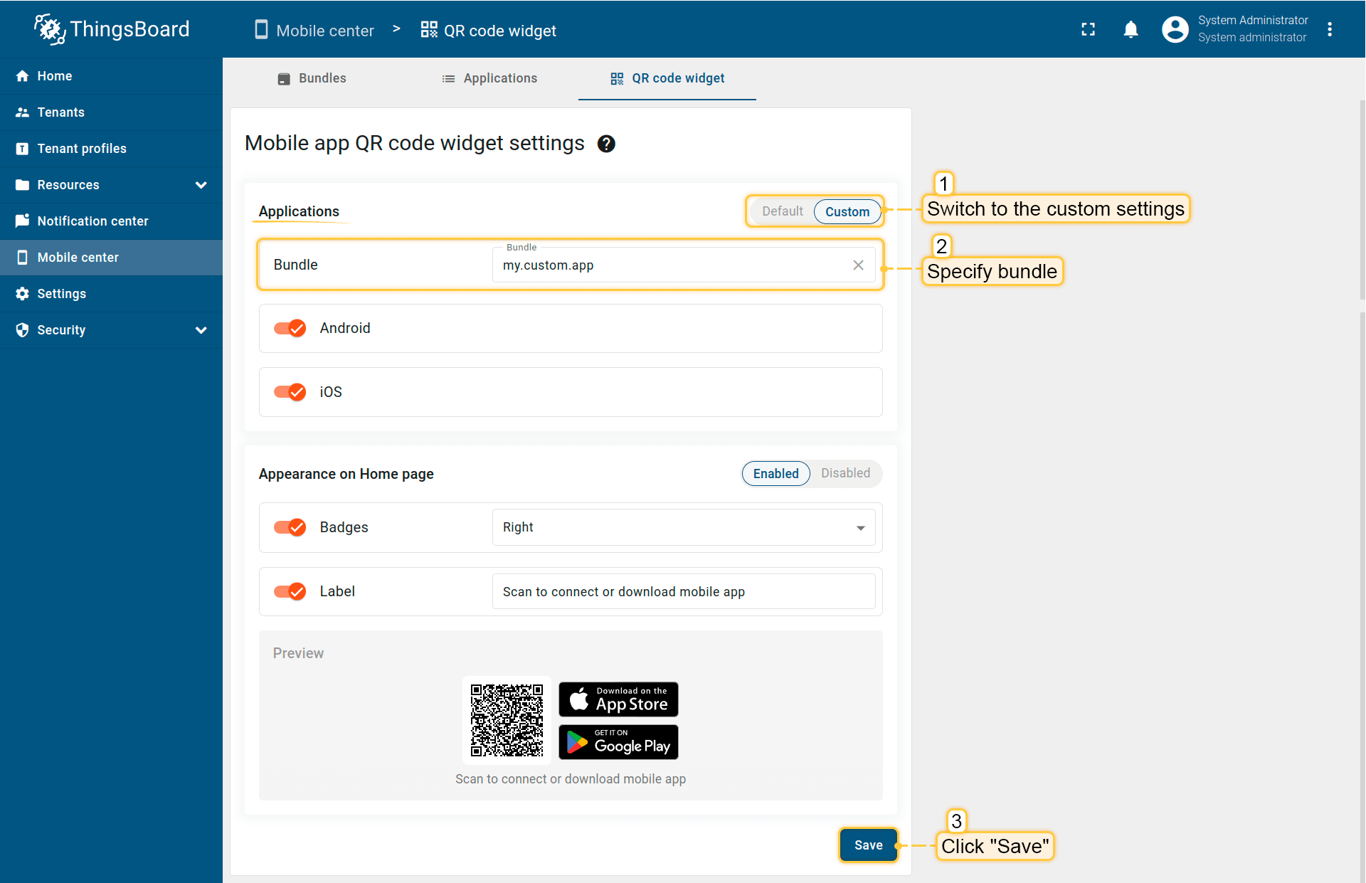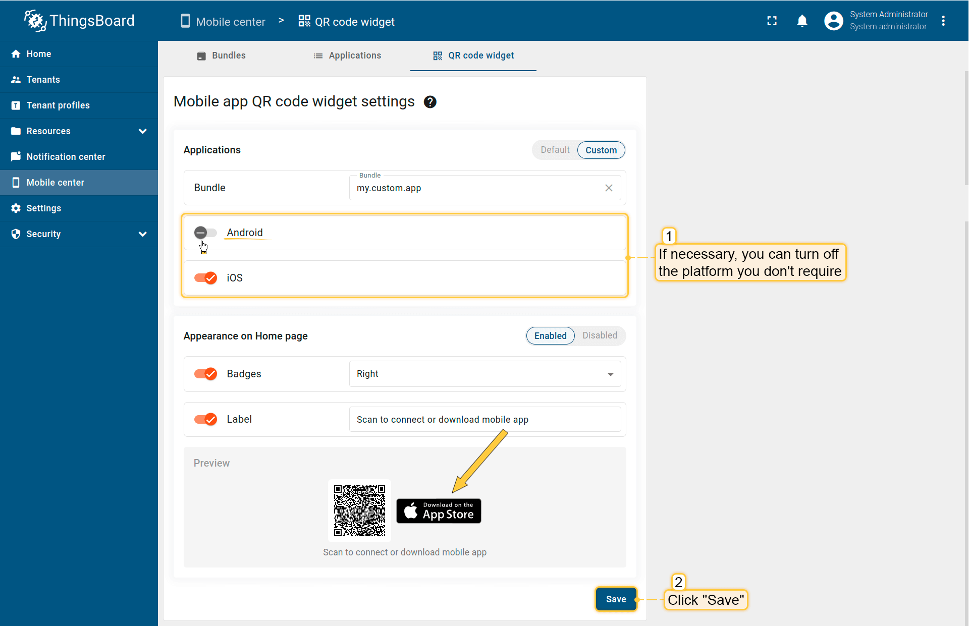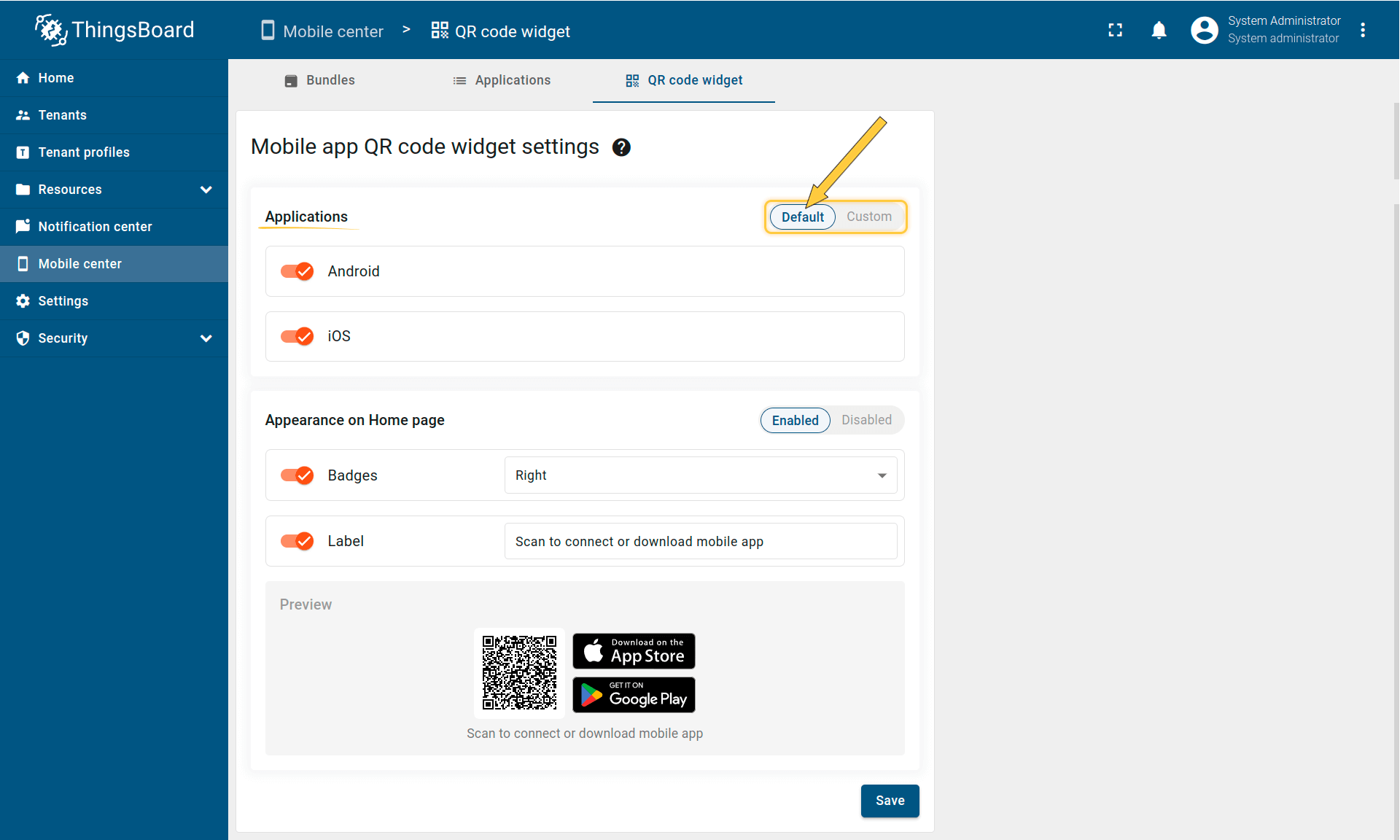The mobile application QR code widget settings configuration is available only on the system level. For this, log in as the system administrator and navigate to the “QR code widget” tab on the “Mobile center” page, and disable “Use system settings” toggle.