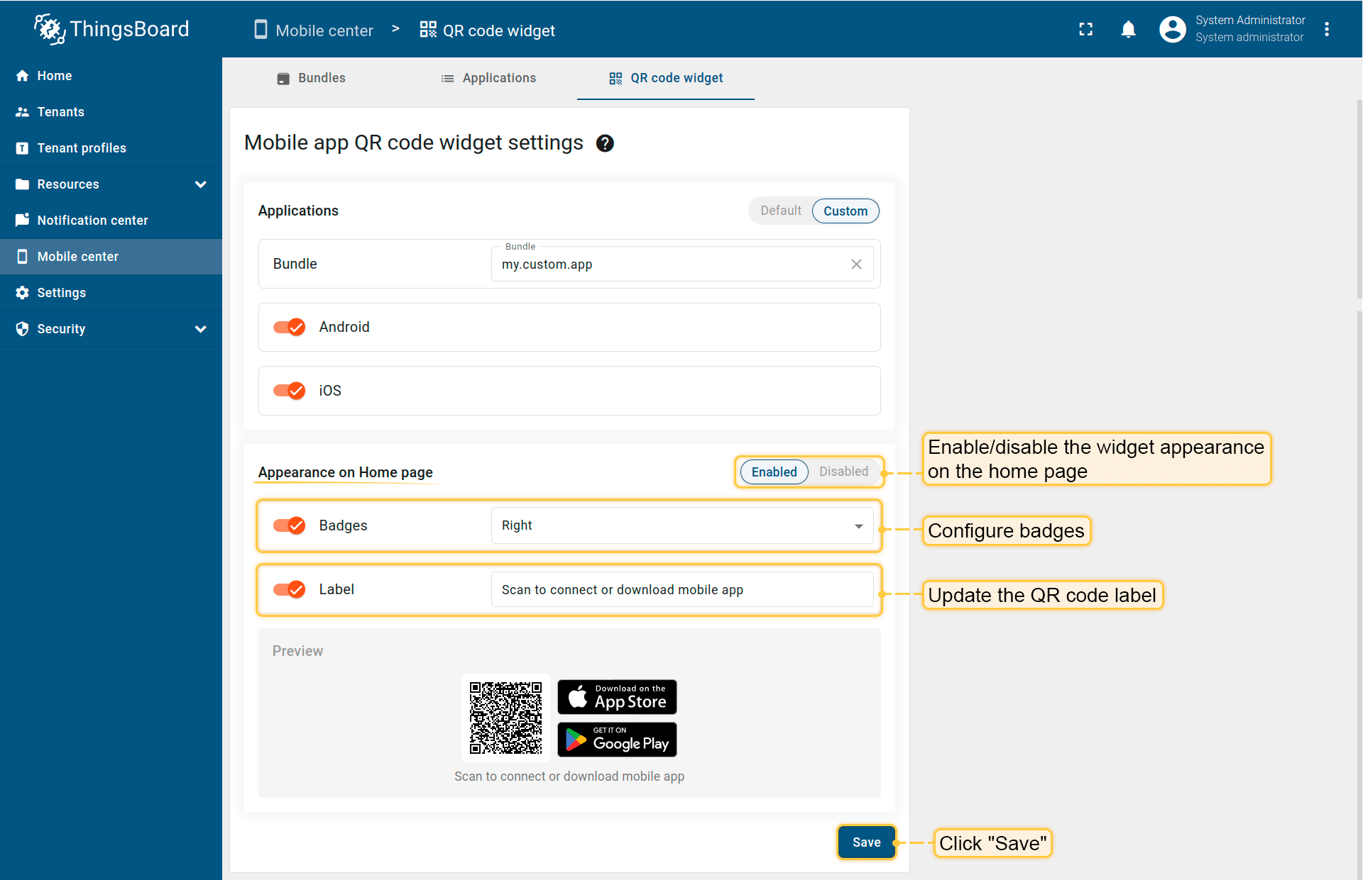 You can disable the QR code widget on the “Home” page, adjust the positioning of the badges, and update the QR code label to better suit your needs.