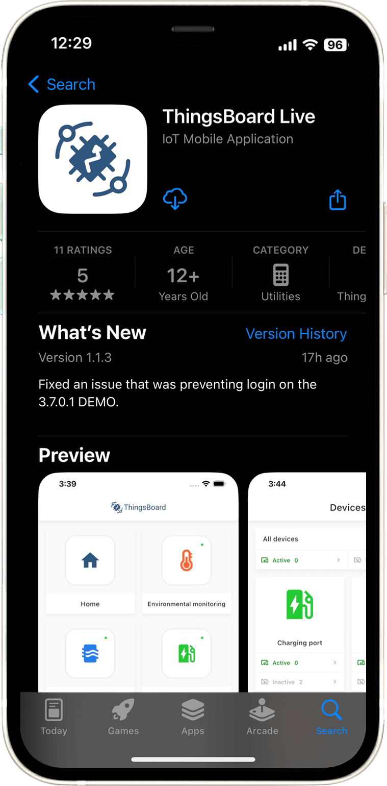 Additionally, by clicking the “App Store” or “Google Play” button in the “Connect mobile app” widget, you will be redirected to the ThingsBoard app page in the respective app store for further downloading to your device.